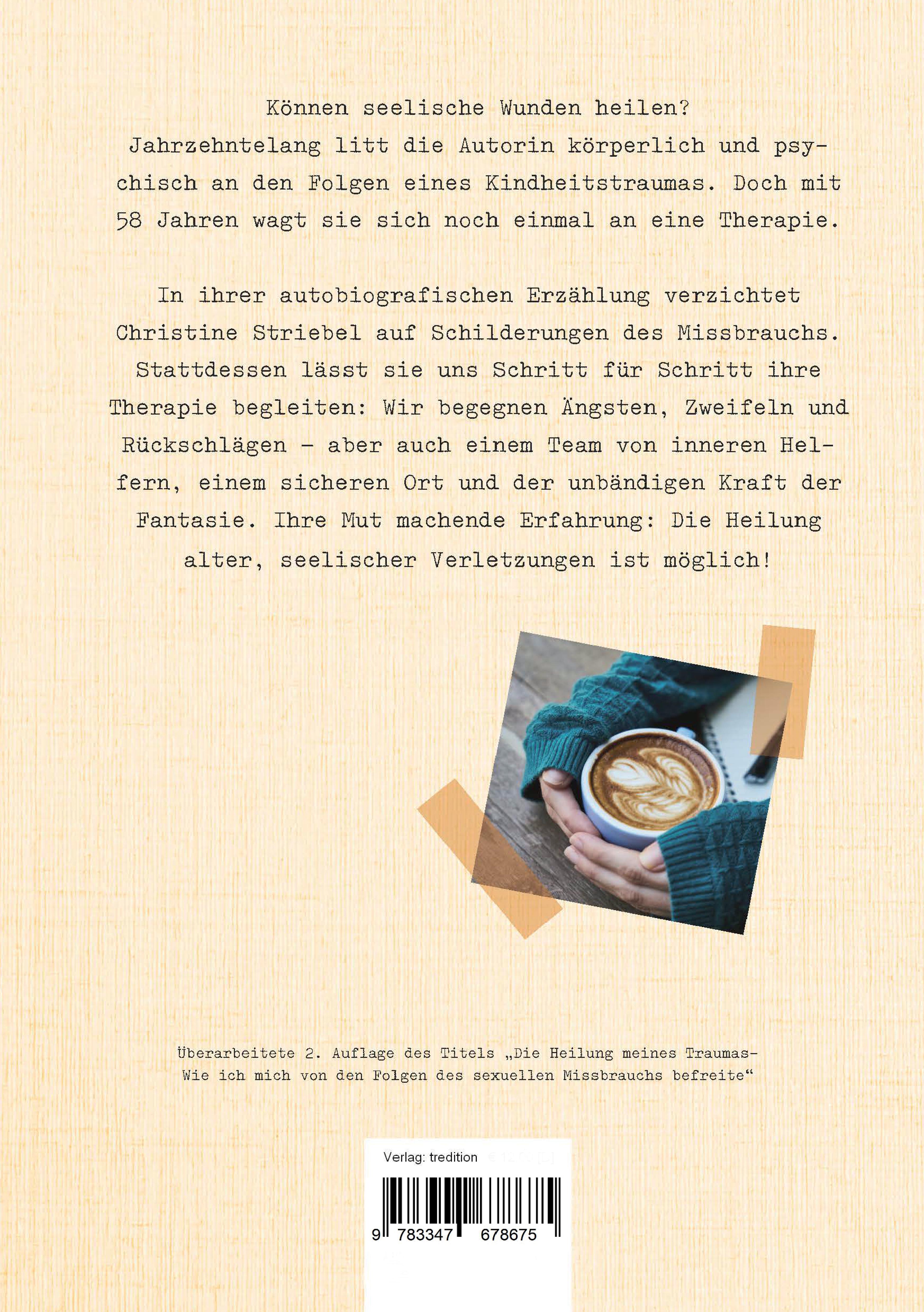 Das Tagebuchschreiben wurde Christine Striebel zum Rettungsanker, nachdem im Alter von 41 Jahren die Erinnerungen an die sexuelle Gewalt ihrer Kindheit zurückkehrten. Es folgte eine schwere Zeit, in der sie sich dem Tod oft näher fühlte als dem Leben. Nachdem sie mithilfe von Therapien zurück ins Leben gefunden hatte, wollte sie der Welt zeigen, dass man ein solches Trauma überwinden kann. Ihr Überlebenstagebuch arbeitete sie um – zu ihrem ersten Selbsthilfebuch „Nicht allein. Überstützung von Betroffenen sexueller Gewalt“, das sie 2004 veröffentlichte. Es folgten die Bücher „Schritt für Schritt ins Leben“ und „Die Heilung meines Traumas“. Die 1952 in Stuttgart geborene Autorin arbeitete als Grund- und Hauptschullehrerin bis sie 1996 wegen einer Posttraumatischen Belastungsstörung in den Vorruhestand trat. Seitdem widmet sie sich dem Schreiben und der psychologischen Beratung. Sie ist verheiratet und Mutter zweier erwachsener Kinder. Weitere Informationen: www.chancezuleben.de