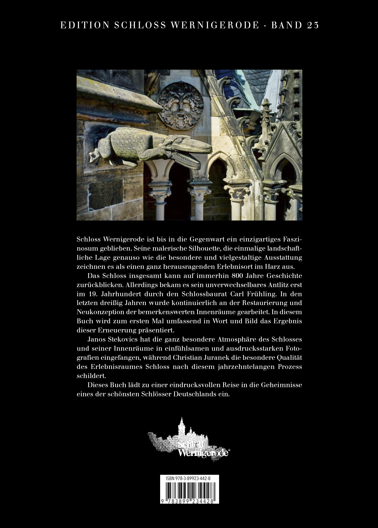Schloss Wernigerode ist bis in die Gegenwart ein einzigartiges Faszinosum geblieben. Seine malerische Silhouette, die einmalige landschaftliche Lage genauso wie die besondere und vielgestaltige Ausstattung zeichnen es als einen ganz herausragenden Erlebnisort im Harz aus.Das Schloss insgesamt kann auf immerhin 800 Jahre Geschichte zurückblicken. Allerdings bekam es sein unverwechselbares Antlitz erst im 19. Jahrhundert durch den Schlossbaurat Carl Frühling. In den letzten dreißig Jahren wurde kontinuierlich an der Restaurierung und Neukonzeption der bemerkenswerten Innenräume gearbeitet. In diesem Buch wird zum ersten Mal umfassend in Wort und Bild das Ergebnis dieser Erneuerung präsentiert. Janos Stekovics hat die ganz besondere Atmosphäre des Schlosses und seiner Innenräume in einfühlsamen und ausdrucksstarken Fotografien eingefangen, während Christian Juranek die besondere Qualität des Erlebnisraumes Schloss nach diesem jahrzehntelangen Prozess schildert. Dieses Buch lädt zu einer eindrucksvollen Reise in die Geheimnisse eines der schönsten Schlösser Deutschlands ein.
