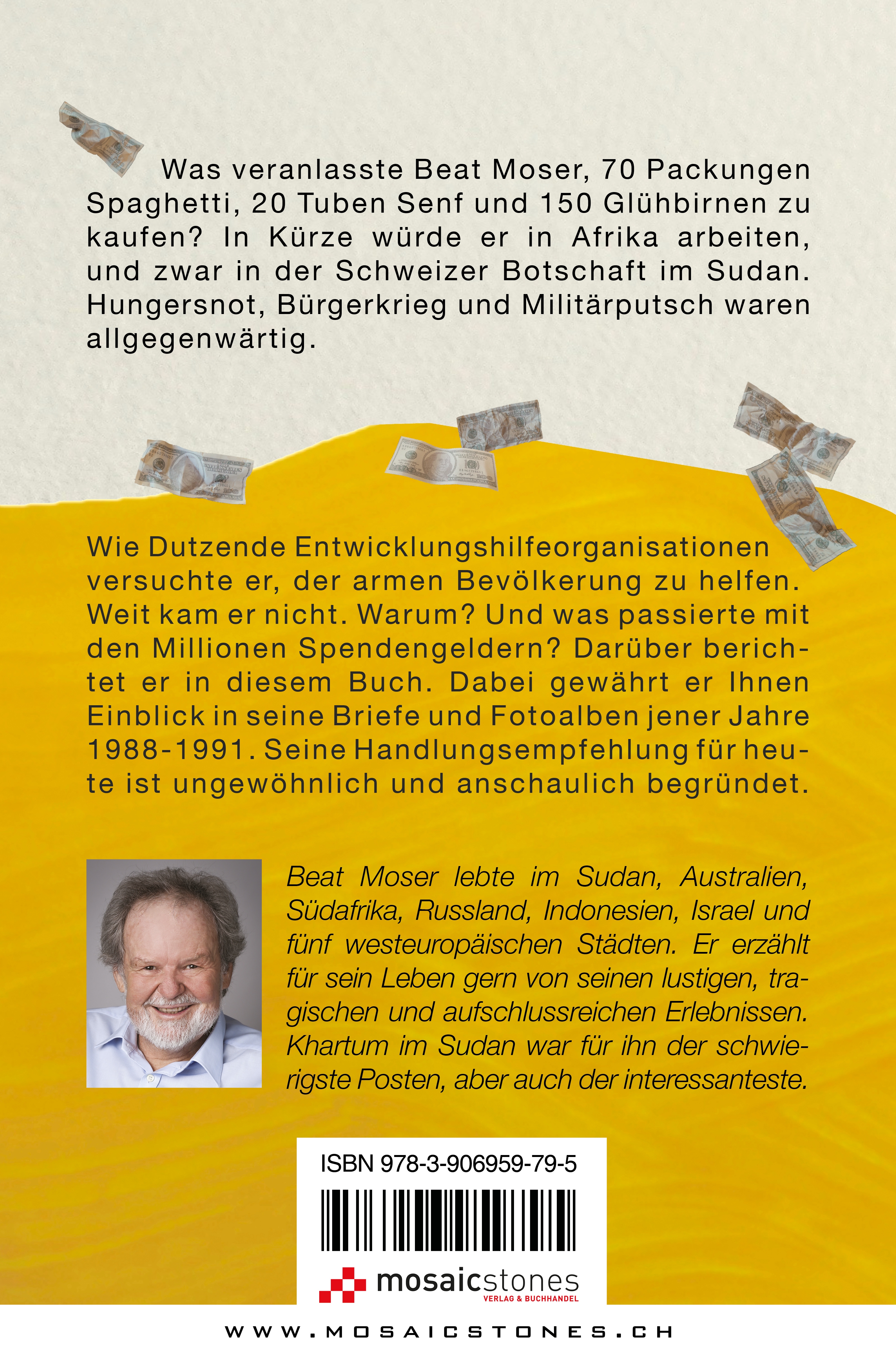 Was veranlasste Beat Moser, 70 Packungen Spaghetti, 20 Tuben Senf und 150 Glühbirnen zu kaufen? In Kürze würde er in Afrika arbeiten, und zwar in der Schweizer Botschaft im Sudan. Hungersnot, Bürgerkrieg und Militärputsch warenallgegenwärtig.Wie Dutzende Entwicklungshilfeorganisationen versuchte er, der armen Bevölkerung zu helfen. Weit kam er nicht. Warum? Und was passierte mit den Millionen Spendengeldern? Darüber berichtet er in diesem Buch. Dabei gewährt er Ihnen Einblick in seine Briefe und Fotoalben jener Jahre 1988-1991. Seine Handlungsempfehlung für heute ist ungewöhnlich und anschaulich begründet.