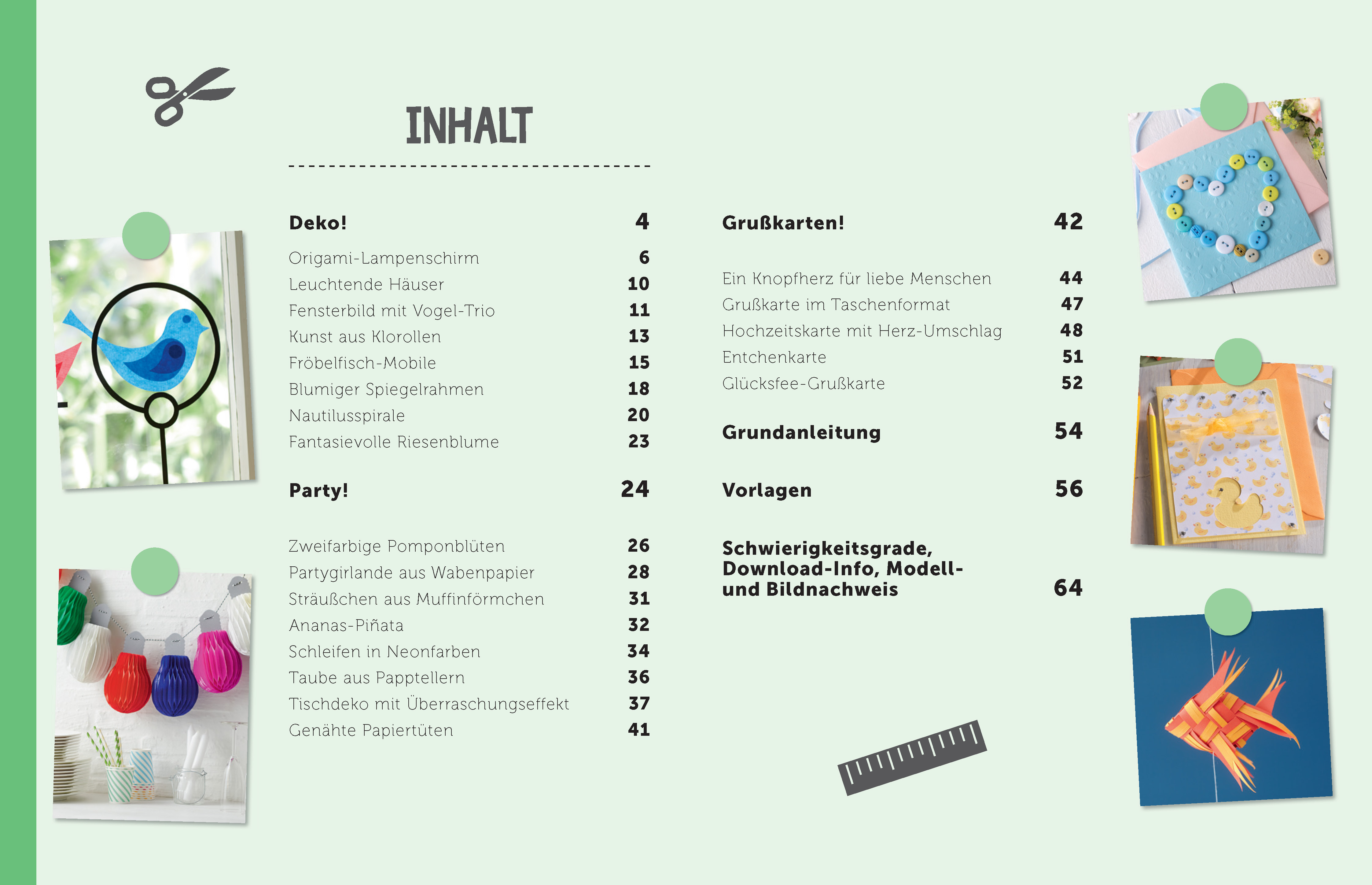 Falten und schneiden, rollen und nähen, biegen und kleben mit Papier geht einfach alles! Von Origami-Lampe über Ananas- Pinata bis Quietscheentchen-Grußkarte: Verschönern Sie Ihr Zuhause, sorgen Sie für Stimmung auf der nächsten Feier und machen Sie Ihren Lieben mit selbst gestalteten Grüßen eine Freude. Mehr als 20 abwechslungsreiche Modelle warten auf Sie!