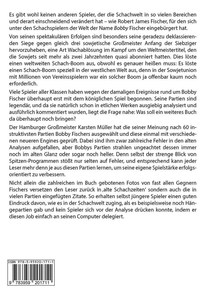 Es gibt wohl keinen anderen Spieler, der die Schachwelt in so vielen Bereichen und derart einschneidend verändert hat - wie Robert James Fischer, für den sich unter den Schachspielern der Welt der Name Bobby Fischer eingebürgert hat.Von seinen spektakulären Erfolgen sind besonders seine geradezu deklassierenden Siege gegen gleich drei sowjetische Großmeister Anfang der Siebziger hervorzuheben, eine Art Wachablösung im Kampf um den Weltmeistertitel, den die Sowjets seit mehr als zwei Jahrzehnten quasi abonniert hatten. Dies löste einen weltweiten Schach-Boom aus, obwohl es genauer heißen muss: Es löste einen Schach-Boom speziell in der westlichen Welt aus, denn in der Sowjetunion mit Millionen von Vereinsspielern war ein solcher Boom ja offenbar kaum noch erforderlich.Viele Spieler aller Klassen haben wegen der damaligen Ereignisse rund um Bobby Fischer überhaupt erst mit dem königlichen Spiel begonnen. Seine Partien sind legendär, und da sie natürlich schon in etlichen Werken ausgiebig analysiert und ausführlich kommentiert wurden, liegt die Frage nahe: Was soll ein weiteres Buch da überhaupt noch bringen?Der Hamburger Großmeister Karsten Müller hat die seiner Meinung nach 60 in- struktivsten Partien Bobby Fischers ausgewählt und diese einmal mit verschiedenen neueren Engines geprüft. Dabei sind ihm zwar zahlreiche Fehler in den alten Analysen aufgefallen, aber Bobbys Partien strahlen ungeachtet dessen immer noch im alten Glanz oder sogar noch heller. Denn selbst der strenge Blick von Spitzen-Programmen stößt nur selten auf Fehler, und entsprechend kann jeder Leser mehr denn je aus diesen Partien lernen, um seine eigene Spielstärke erfolgsorientiert zu verbessern.Nicht allein die zahlreichen im Buch gebotenen Fotos von fast allen Gegnern Fischers versetzen den Leser zurück in 'alte Schachzeiten' sondern auch die in vielen Partien eingefügten Zitate. So erhalten selbst jüngere Spieler einen guten Eindruck davon, wie es in der Schachwelt zuging, als es beispielsweise noch Hängepartien gab und kein Spieler sich vor der Analyse drücken konnte, indem er diesen Job einfach an seinen Computer delegiert.