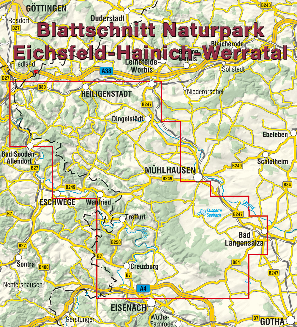 Die neue reiß- und wetterfeste Rad- und Wanderkarte „Naturpark Eichsfeld-Hainich-Werratal“ erfasst den gesamten Naturpark und den Nationalpark Hainich im Maßstab 1:33 000 mit dem vollständigen Rad- und Wanderwegenetz. Die Karte stellt die Region von Heiligenstadt über Leinefelde, Dingelstädt bis Mühlhausen, Bad Langensalza, Treffurt und Creuzburg bis zur Landesgrenze nach Hessen vor und schließt damit an die hessischen Karten Geo-Naturpark Frau Holle Land, sowie an die Karte Eschwege an.