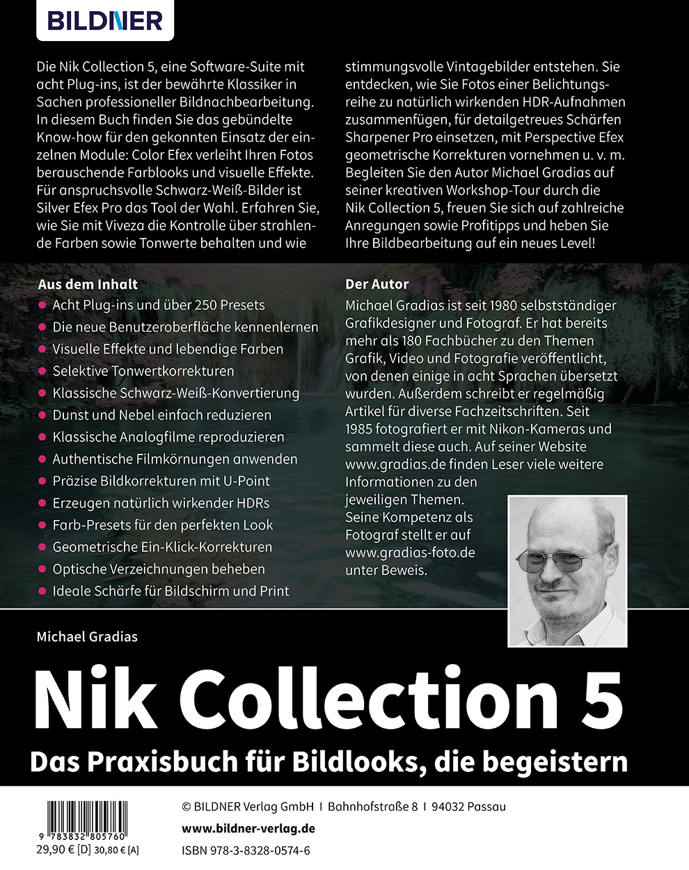Die Nik Collection 5, eine Software-Suite mit acht Plug-ins, ist der bewährte Klassiker in Sachen professioneller Bildnachbearbeitung. In diesem Buch finden Sie das gebündelte Know-how für den gekonnten Einsatz der einzelnen Module: Color Efex verleiht Ihren Fotos berauschende Farblooks und visuelle Effekte. Für anspruchsvolle Schwarz-Weiß-Bilder ist Silver Efex Pro das Tool der Wahl. Erfahren Sie, wie Sie mit Viveza die Kontrolle über strahlende Farben sowie Tonwerte behalten und wie stimmungsvolle Vintagebilder entstehen. Sie entdecken, wie Sie Fotos einer Belichtungsreihe zu natürlich wirkenden HDR-Aufnahmen zusammenfügen, für detailgetreues Schärfen Sharpener Pro einsetzen, mit Perspective Efex geometrische Korrekturen vornehmen u. v. m.