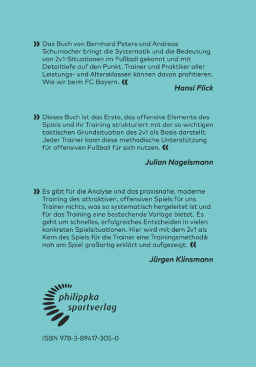 Das Buch ist dank seiner ausführlichen, leicht verständlichen Beschreibungen und zahlreicher Merkkästen mit einprägsamen Kernaussagen für Trainer aller Leistungsklassen geeignet. Im letzten Kapitel brechen Bernhard Peters und Andreas Schumacher das 2v1 sogar auf das intuitive Spiel des Kinderfußballs im 3v3, 5v5 und 7v7 herunter. Weit mehr als nur ein Gimmick sind zudem die das gesamte Buch begleitenden und per QR-Code abrufbaren Animationen zu ausgewählten Situationen und Trainingsformen.