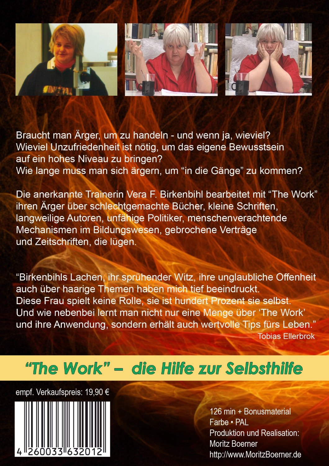 Braucht man Ärger, um zu handeln - und wenn ja, wieviel? Wieviel Unzufriedenheit ist nötig, um das eigene Bewusstsein auf ein hohes Niveau zu bringen? Wie lange muss man sich ärgern, um 'in die Gänge' zu kommen? Die anerkannte Trainerin Vera F. Birkenbihl bearbeitet mit 'The Work' ihren Frust über schlechtgemachte Bücher, kleine Schrift, langweilige Autoren, unfähige Politiker, Steuerprogression, menschenverachtende Mechanismen im Bildungswesen, gebrochene Verträge, unlautere Praktiken ehemaliger Geschäftspartner und Zeitschriften, die Lügen verbreiten. *** Im Zuge der Recherchen zu ihrem Buch 'Jeden Tag weniger ärgern' entdeckte Vera F. Birkenbihl im Buch 'Byron Katies The Work' von Moritz Boerner die Methode der Amerikanerin und kontaktierte den Autor. Hieraus ergab sich eine mittlerweile jahrelange Freundschaft. Boerner trat im Vortrag 'Vera F. Birkenbihl Anti-Ärger-Strategien' auf und die beiden produzierten eine erste DVD über The Work. Was lag also näher, als einmal gesprächsweise auszuprobieren, ob der eine oder andere kleine oder größere Ärger der berühmten Querdenkerin sich mit der Fragetechnik beeinflussen lassen würde?