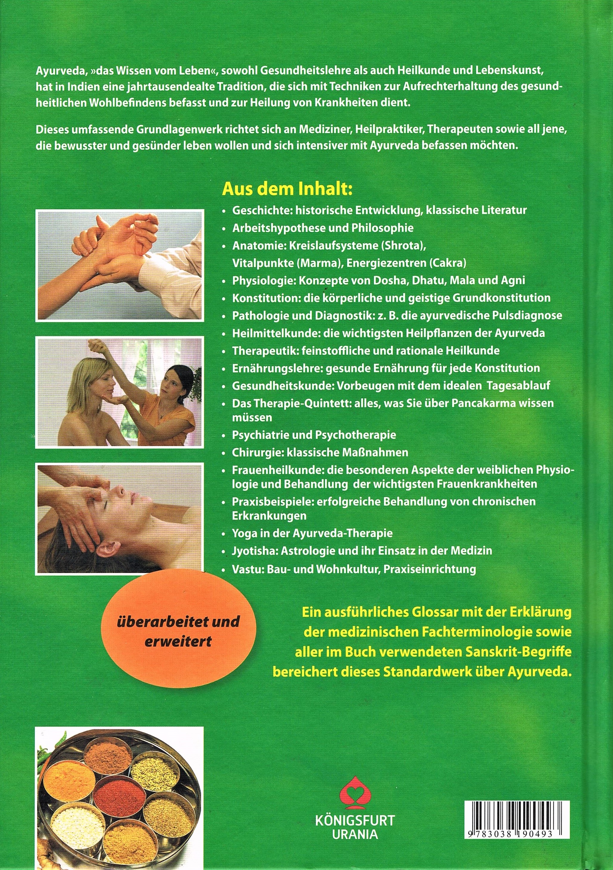 Ein umfassendes Grundlagenwerk, das sich sowohl an Mediziner, Heilpraktiker und Therapeuten als auch an Interessierte wendet, die bewusster, gesünder leben wollen und sich intensiver mit Ayurveda befassen möchten.Auf 608 Seiten werden die Aspekte der ayurvedischen Heilkunst abgehandelt. Beginnend mit der Geschichte folgen unter anderem Kapitel über Anatomie, Konstitution, Diagnostik und Heilmittel, Ernährungs- und Gesundheitslehre, Therapien, Kapitel über Psychiatrie, Chirurgie und Frauenheilkunde. Auf die Bedeutung von Yoga im Ayurveda wird ebenso eingegangen wie auf die Art der Wohnkultur. Im Anhang befindet sich ein ausführliches Glossar zu den Fachbegriffen sowie ein Register.