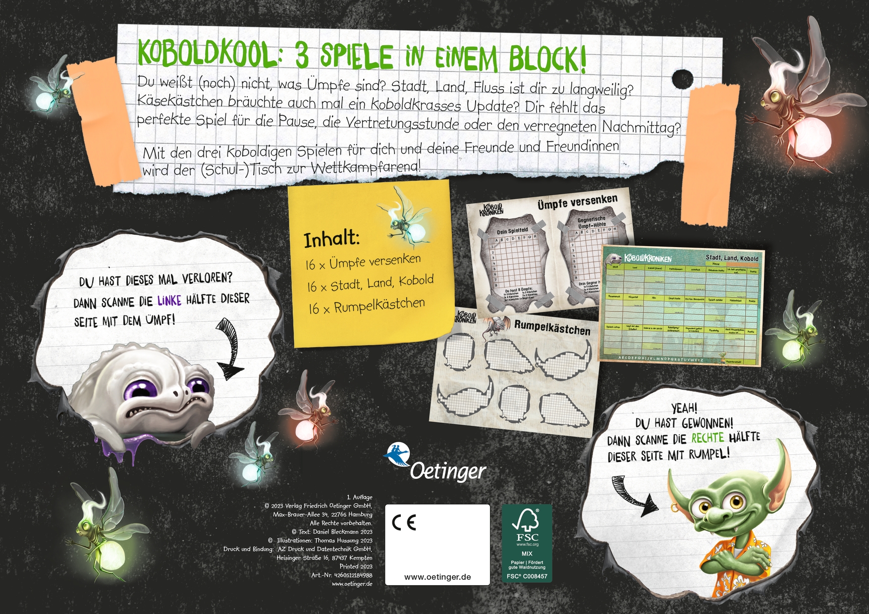 Wie wär's mit 'ner Runde Stadt, Land, Kobold, Ümpfe versenken oder Rumpelkästchen? Hier kommt dein ultimativer Spieleblock, 48 Seiten dick mit den beliebten "Schulspielen" Schiffe versenken, Käsekästchen und Stadt, Land, Fluss - nur eben für Fans der krandios kroßartigen KoboldKroniken.