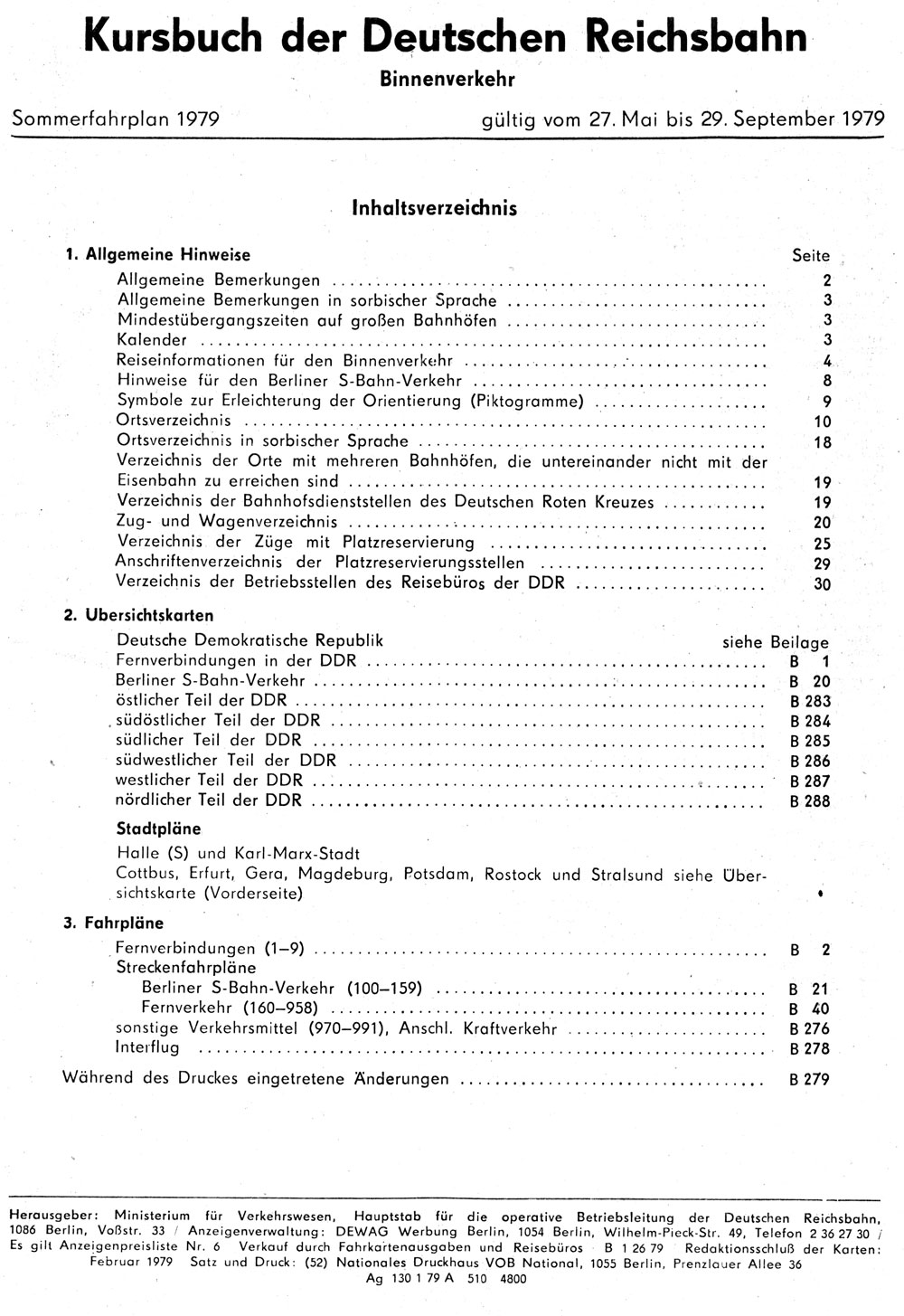 Sommerfahrplan. Gültig vom 27. Mai bis 29. September 1979, Taschenbuch, A 5, 324 Seiten, Reprint, Kursbuch der DDR. Übersichtskarten befinden sich im Buch - ohne eine Gesamtübersichtskarte als Beilage.Mit den Eisenbahndirektionen in der DDR: Karl-Marx-Stadt, Leipzig, Magdeburg, Potsdam, Rostock; Berlin, Cottbus, Dresden, Erfurt und Gera