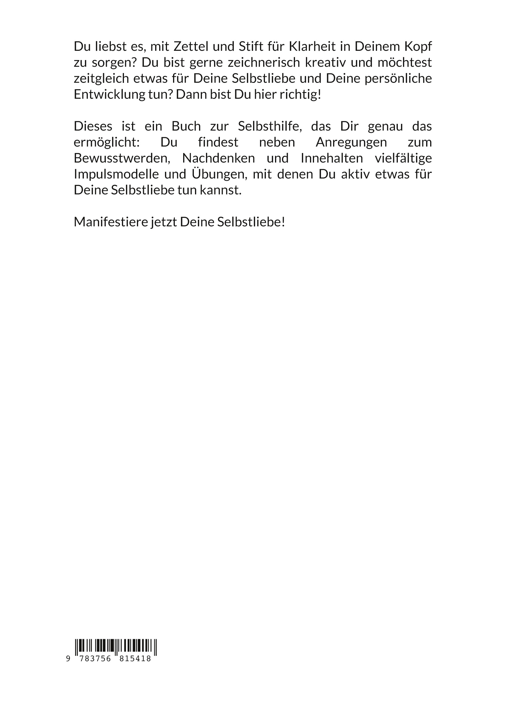 Du liebst es, mit Zettel und Stift für Klarheit in Deinem Kopf zu sorgen? Du bist gerne zeichnerisch kreativ und möchtest zeitgleich etwas für Deine Selbstliebe und Deine persönliche Entwicklung tun? Dann bist Du hier richtig!Dieses ist ein Buch zur Selbsthilfe, das Dir genau das ermöglicht: Du findest neben Anregungen zum Bewusstwerden, Nachdenken und Innehalten vielfältige Impulsmodelle und Übungen, mit denen Du aktiv etwas für Deine Selbstliebe tun kannst.Manifestiere jetzt Deine Selbstliebe!