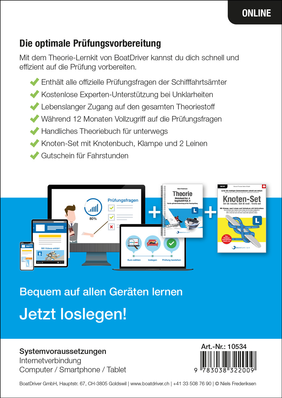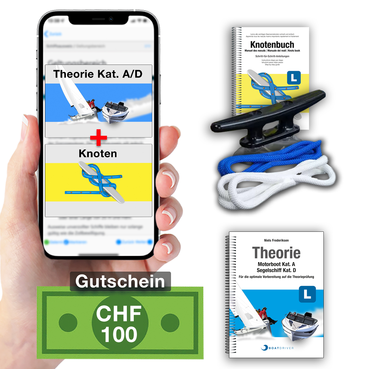 Lizenzkarte für Onlinekurs Theorie Kat. A/D, Theorie-Buch, Knoten-Set, Praxis-Gutschein