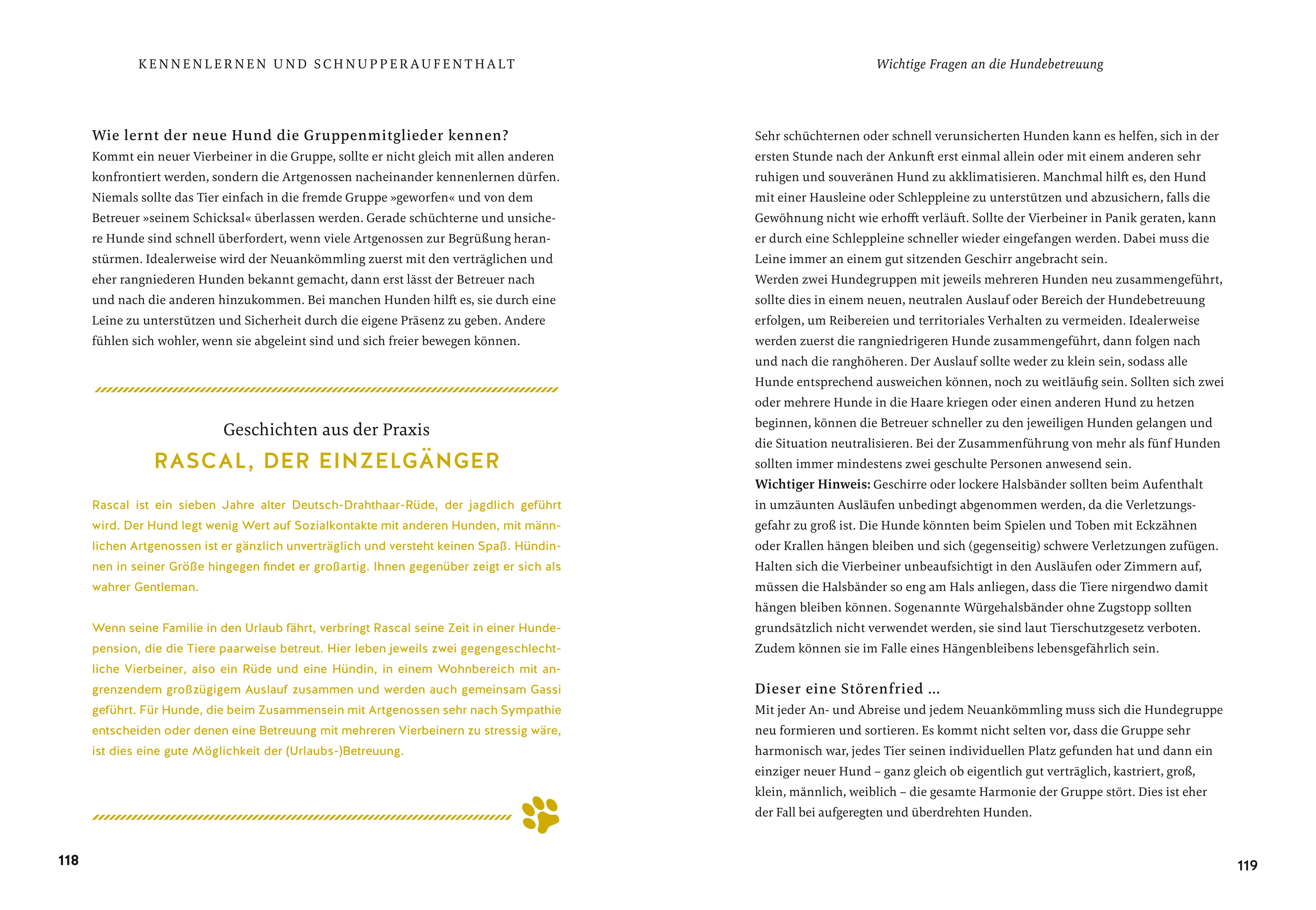 Dieser Praxisratgeber bietet ausführliche Informationen zum Thema Hundebetreuung. Denn häufig wird unterschätzt, wie wichtig es ist, für den Vierbeiner frühzeitig eine passende Unterbringung zu finden, wenn ein Urlaub oder Krankenhausaufenthalt ansteht und der Job eine Tagesbetreuung nötig macht. Welche Möglichkeiten der Betreuung gibt es? Wie bereitet man den Hund auf den Aufenthalt in neuer Umgebung vor? Ursula Kufner beschreibt umfassend alle Phasen vom gegenseitigen Kennenlernen bis zum Abholen des Hundes. Dabei geht es auch um das Gefühlsleben: Was empfindet mein Hund, wenn er in eine Betreuung gegeben wird? Wie erkenne ich, ob er sich wohlfühlt? Ist der Hund gut versorgt, ist auch der Mensch entspannt.