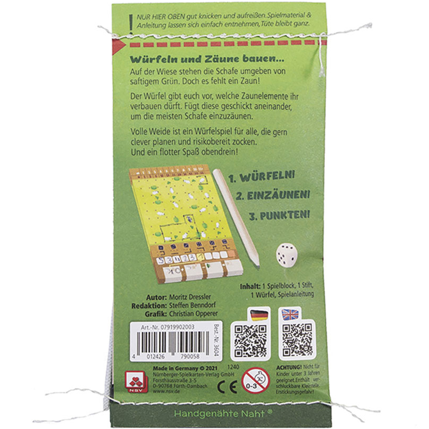 Auf der Wiese stehen die Schafe umgeben von saftigem Grün. Doch es fehlt ein Zaun! Der Würfel gibt euch vor, welche Zaunelemente ihr verbauen dürft. Fügt diese geschickt aneinander, um die meisten Schafe einzuzäunen. VOLLE WEIDE ist ein Würfelspiel für alle, die gern clever planen und risikobereit zocken. Und ein flotter Spaß obendrein!