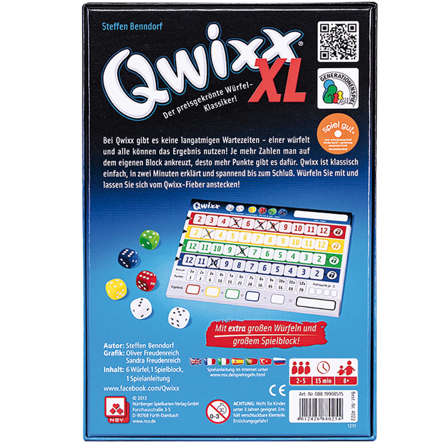 Bei Qwixx XL ist alles etwas größer. Größere Würfel (18mm) und ein größerer Spielblock (A6) machen alles einfacher. Wer auch unter schwierigen Bedingungen richtig Spaß haben möchte oder eine Affinität zu großen Würfeln hat, liegt hier goldrichtig! Ansonsten bringt auch Qwixx XL alles mit, was ein echter Würfel-Klassiker braucht: einfache Regeln, niedriger Preis, großer Spielspaß! Und das Besondere dabei: es gibt keine langatmigen Wartezeiten, alle sind stets am Geschehen beteiligt! Jeder möchte möglichst viele Kreuze machen. Ob das gelingt, hängt von der eigenen Entscheidung, aber natürlich auch vom Würfelglück ab. Die Spannung steigt. Wer macht einen Fehlwurf? Wer schließt die Reihen zuerst? Das Qwixx-Fieber packt jeden!