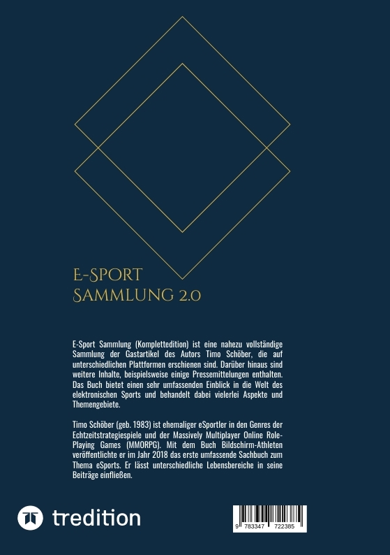 Anmerkung: Wer bereits die erste Version der E-Sport Sammlung besitzt, sollte sich nicht die neue Auflage kaufen, da hier nur ein paar Änderungen vorgenommen worden sind.E-Sport Sammlung (Komplettedition) ist eine nahezu vollständige Sammlung der Gastartikel des Autors Timo Schöber, die auf unterschiedlichen Plattformen erschienen sind. Darüber hinaus sind weitere Inhalte, beispielsweise einige Pressemittelungen enthalten. Das Buch bietet einen sehr umfassenden Einblick in die Welt des elektronischen Sports und behandelt dabei vielerlei Aspekte und Themengebiete.
