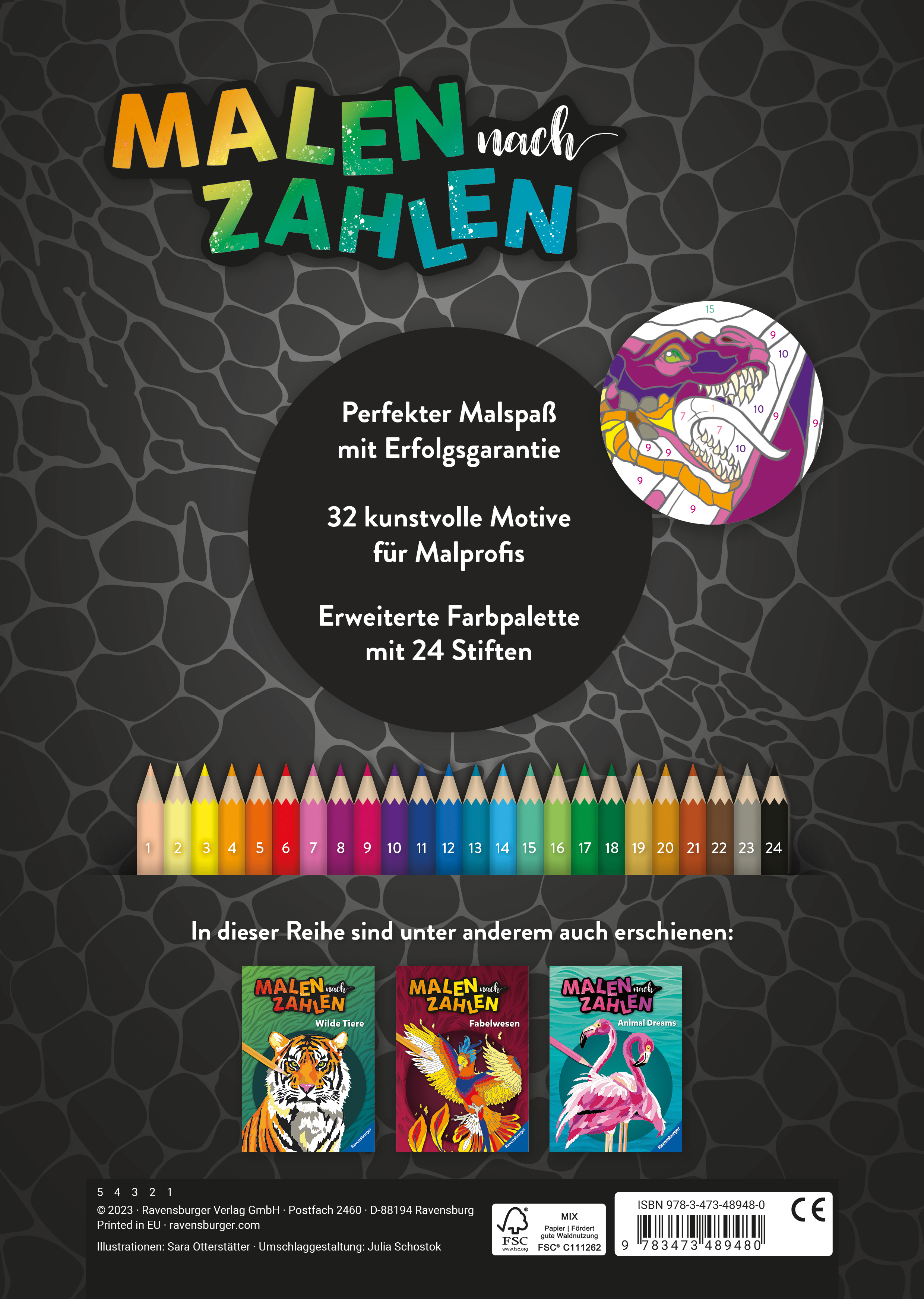 Malen wie die Profis - das ist mit der Ravensburger Erfolgsreihe "Malen nach Zahlen" kinderleicht: Alle Ausmalfelder enthalten Zahlen, die die Farben vorgeben. Die Ziffern sind gut lesbar, aber so zart, dass sie beim Übermalen verschwinden. Feld für Feld entstehen bunte, detailreiche Bilder. Und auch anspruchsvolle Motive wie Pferde oder Dinosaurier werden erfolgreich gemeistert. Die Reihe führt Mal-Angebote für vier Altersstufen (ab 3, ab 5, ab 7 und von 9-99 Jahren) sowie motivierende Lern-Blöcke für Kinder von 5 - 8 Jahren. Für die Kleinen ab 3 Jahren haben die Malflächen farbige Zahlen und farbige Rahmenlinien. Die Titel ab 5 Jahren erleichtern das Malen allein über die Farbe der Zahlen. Hefte für Kinder ab 7 fordern bewusst die Feinmotorik. Und wer schon über 9 Jahre alt ist und Malen- nach- Zahlen- Fan, der findet hier extradicke Titel voller Malvorlagen, die kein Alter kennen.