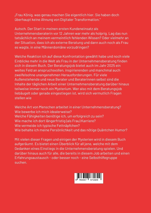 "Frau König, was genau machen Sie eigentlich hier. Sie haben doch überhaupt keine Ahnung von Digitaler Transformation." Autsch. Der Start in meinen ersten Kundeneinsatz als Unternehmensberaterin vor 12 Jahren war mehr als holprig. Lag das nun tatsächlich an meinem vermeintlich fehlenden Wissen? Oder vielmehr an der Situation, dass ich als externe Beratung und dann auch noch als Frau es wagte, in eine Männerdomäne vorzudringen? Welche Reaktion ich auf diese Konfrontation gewählt habe und noch viele Einblicke mehr in die Welt als Frau in der Unternehmensberatung finden sich in diesem Buch.Der Beratungsjob bietet auch im Jahr 2022 ein weites Feld an anspruchsvollen, inspirierenden und manchmal auch zweifelsohne unangenehmen Herausforderungen. Für viele Außenstehende und neue Berater und Beraterinnen selbst sind die Inhalte der täglichen Arbeit einer Unternehmensberatung darüber hinaus teilweise immer noch ein Mysterium. Wer also mit dem Beratungsjob liebäugelt oder gerade eingestiegen ist, wird sich vermutlich Fragen stellen wie Welche Art von Menschen arbeitet in einer Unternehmensberatung? Wie bewerbe ich mich idealerweise?Welche Fähigkeiten benötige ich, um erfolgreich zu sein? Wie mache ich dort längerfristig (als Frau) Karriere?Wie vermeide ich typische Fettnäpfchen?Wie behalte ich meine Persönlichkeit und das nötige Quäntchen Humor?Mit vielen dieser Fragen und einigen der Mysterien wird in diesem Buch aufgeräumt. Es bietet eine Übersicht für all jene, welche mit dem Gedanken eines Einstiegs in die Unternehmensberatung spielen. Und darüber hinaus auch für alle, die bereits in diesem Job arbeiten und einen Erfahrungsaustausch oder eher noch - eine Selbsthilfegruppe - suchen.