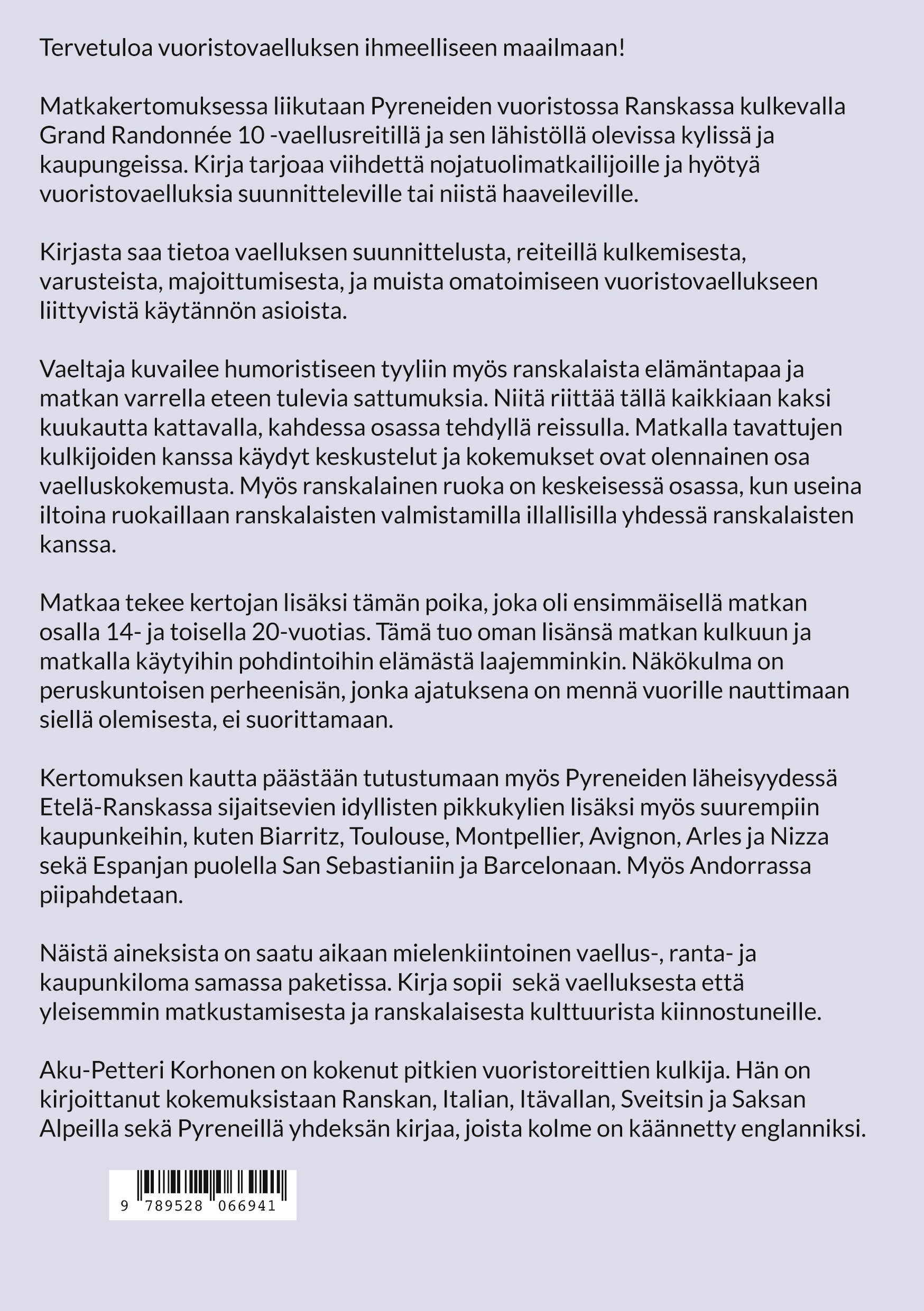 Matkakertomuksessa liikutaan Pyreneiden vuoristossa Ranskassa kulkevalla Grand Randonnée 10 -vaellusreitillä ja sen lähistöllä olevissa kylissä ja kaupungeissa. Kirja tarjoaa viihdettä nojatuolimatkailijoille ja hyötyä vuoristovaelluksia suunnitteleville tai niistä haaveileville.
