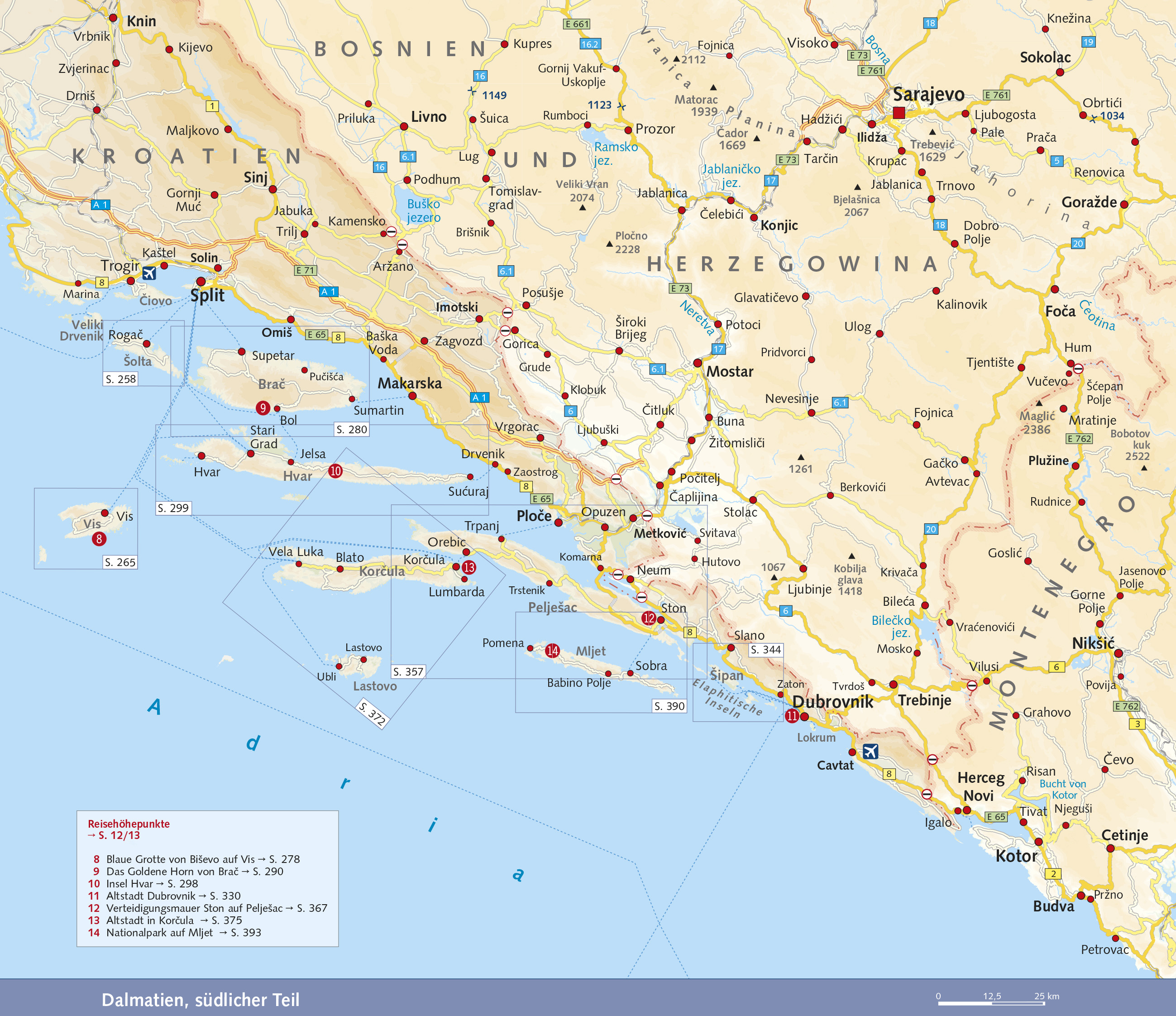 Vorwort 11Herausragende Sehenswürdigkeiten 12Das Wichtigste in Kürze 14Dalmatien mit Kindern 17LAND UND LEUTE 18Die Region Dalmatien 20Geographie und Geologie 20Klima 21Flora und Fauna 22Umweltschutz und Nationalparks 25Geschichte Dalmatiens 27Slawen und Awaren 27Die Steinzeit und die Illyrer 28Griechen und Römer 29Gründung des kroatischen Staates 31Die Herrschaft Venedigs 32Die Osmanen 34Dalmatien unter Österreich-Ungarn 36Der Erste Weltkrieg 38Der Zweite Weltkrieg 39Der Befreiungskampf 40Das sozialistische Jugoslawien 42Die Unabhängigkeit Kroatiens 44Die Folgen des Krieges 46Die politische Lage 47Politik, Gesellschaft und Wirtschaft 49Gesellschaft und Religion 49Wirtschaft 54Tourismus 54Medien 56Kultur 59Architektur 59Maler und Bildhauer 61Brauchtum und Tradition 63Film 64Literatur 65Sprache 67Musik 70Die dalmatinische Küche 71DIE REGION ZADAR 76Zadar 78Stadtrundgang 79Von Zadar nach Nin 92Nin 93Stadtrundgang 94Insel Vir 100Insel Pag 102Pag-Stadt 106Stari Grad 109Kolan und Mandre 109Sveti Vid 110Novalja und Cissa 111Halbinsel Lun 114Die Inseln Ugljan und Pasman 115Ugljan 116Pasman 122Der Inselarchipel vor Zadar 126Silba 126Olib 130Premuda 133Ist 134Sestrunj 135Molat 136Dugi Otok 139Iz 148Das Hinterland von Zadar 151Novigradsko More 151Novigrad 151Karinsko Moret 153Obrovac Paklenica 154Krupa-Kloster 154Benkovac 155Kula Atlagica 156Festung Asseria 156Auf dem Weg nach Sibenik 158Biograd na Moru 158Vrana-See 160Vrana 161Han Jusufa Maskovica 161SIBENIK UND UMGEBUNG 162Sibenik 164Stadtrundgang 166Ausflüge ab Sibenik 172Das Gebiet der Krka 175Krka-Nationalpark 176Bribir Glavica 180Burnum 181Drnis 182Otavice 183Knin 185Zwischen Sibenik und Murter 187Vodice 187Arauzona 189Tribunj und Pirovac 189Ivinj 190Insel Murter und die Kornaten 191Insel Murter 191Die Kornaten 195Der Archipel vor Sibenik 200Prvic 200Zlarin 205Kaprije 209Zirje 211Krapanj 214Südlich von Sibenik 214SPLIT UND TROGIR 218Split 220Rundgang durch die Altstadt 222Außerhalb des Diokletianpalastes 226Solin 231Salona 232Das Hinterland von Split 233Klis 233Sinj 235Kastela 238Kastel Sucurac 239Kastel Gomilica 239Kastel Kambelovac 239Kastel Luksic 239Kastel Stari 240Kastel Novi 241Kastel Stafilic 241Wanderungen in die Berge 242Trogir 243Stadtrundgang 245Insel Ciovo 253Mali und Veli Drvenik 255Insel Solta 256Grohote 257Westteil der Insel 259Maslinica 260Necujam 261Stomorska 263Insel Vis 265Vis-Stadt 268Rundfahrt über die Insel 273Komiza 275Insel Bisevo 278Insel Brac 281Supetar 282Postira 284Pucisca 285Sutivan 287Lozisca 287Bobovisca 288Von Milna nach Bol 289Bol 290Kloster Blaca 294Murvica 295Selca 295Novo Selo 296Povlja 296Sumartin 297Insel Hvar 298Hvar-Stadt 300Von Hvar-Stadt nach Stari Grad 306Stari Grad 306Vrboska 308Jelsa 309Ausflüge ab Jelsa 310Sucuraj 311Von Split nach Ploce 312Jesenice 312Omis 313Gata 316Brela und Baska Voda 316Makarska 317Biokovo-Gebirge 319Abstecher nach Imotski 319Drvenik 322Zaostrog 322Brist 323Ploce 323DUBROVNIK UND UMGEBUNG 324Dubrovnik 326Die Stadtbefestigung 330Der Stradun 333Insel Lokrum 343Die Elaphitischen Inseln 343Cavtat 345Neretva-Delta 350Opuzen 351Metkovic 352Vid 354Neum 355Halbinsel Peljesac 356Trpanj 358Die Südküste 359Orebic 360Nakovanj, Kuciste, Viganj 362Nakovana 363Kuna 364Potomje 365Ston 367Insel Korcula 371Korcula-Stadt 375Insel Badija 381Insel Vrnik 381Lumbarda 381Smokvica 382Blato 383Vela Luka 385Insel Lastovo 386Insel Mljet 389Babino Polje 392Polace 393Nationalpark Mljet 393Straße nach Saplunara 395Saplunara 395REISETIPPS VON A BIS Z 396Sprachführer 408Glossar 418Literaturhinweise 419Dalmatien im Internet 420Über den Autor/Danksagung 421Register 422Bildnachweis, Kartenregister 432Karten- und Zeichenlegende 434EXTRASWichtige Persönlichkeiten 57Glagolica 69Rezepte 74Paski Si