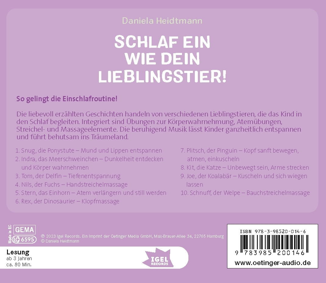 Ich bin klein, ich schlaf ein - und durch! Fantasiereisen, Übungen zur Körperwahrnehmung, Atemübungen, Streichel- und Massageelemente: Einschlafroutinen helfen Kindern dabei, schneller einzuschlafen und häufiger durchzuschlafen. Verpackt in kurze Geschichten, die von verschiedenen Lieblingstieren erzählen, sind sie ein ideales Einschlafritual. Vor allem in Kombination mit der beruhigenden Musik sind sie so konzipiert, dass Kinder ganzheitlich entspannen.