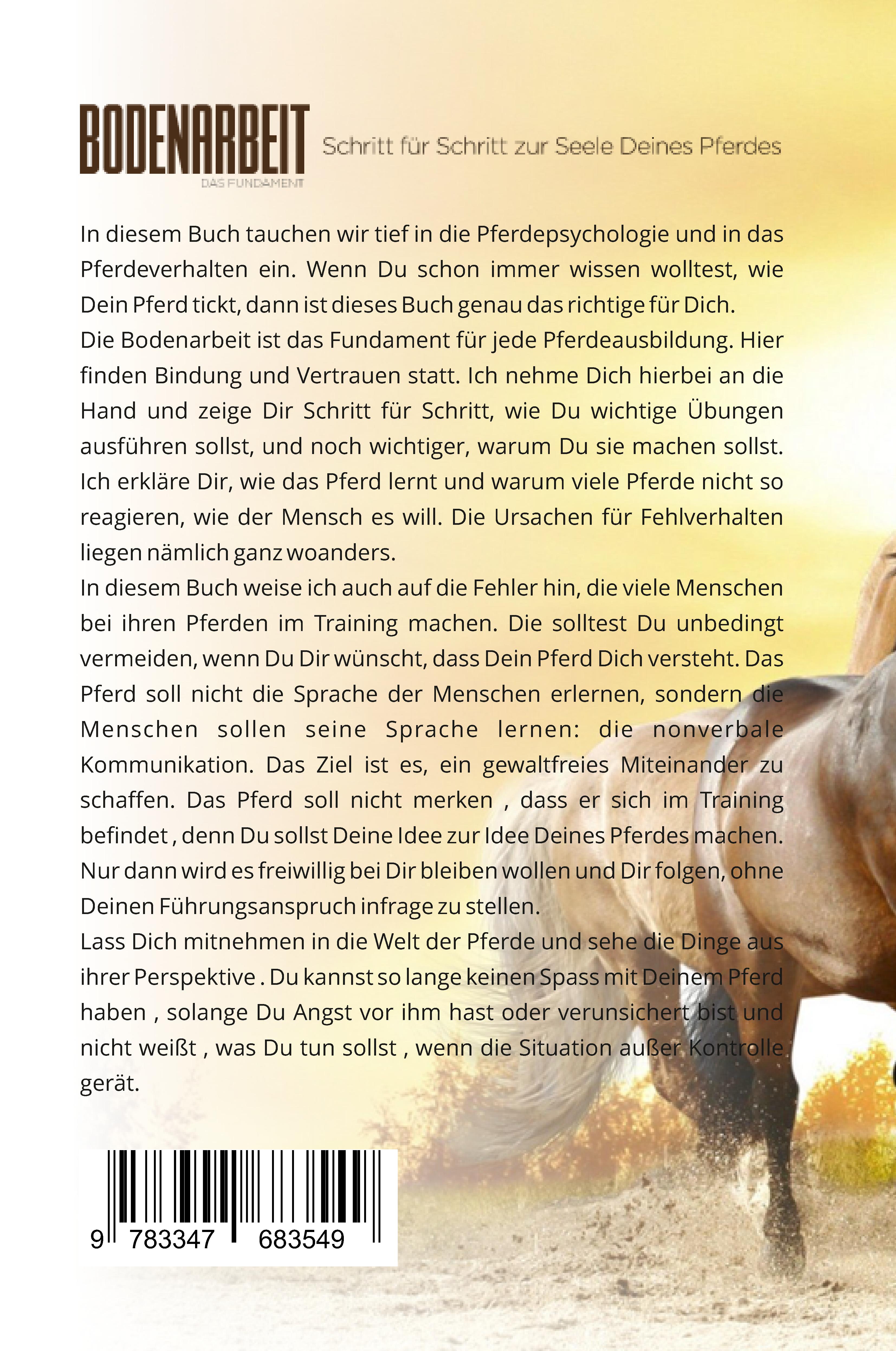 In diesem Buch tauchen wir tief in die Pferdepsychologie und in das Pferdeverhalten ein. Wenn Du schon immer wissen wolltest, wie Dein Pferd tickt, dann ist dieses Buch genau das richtige für Dich. Die Bodenarbeit ist das Fundament für jede Pferdeausbildung. Hier finden Bindung und Vertrauen statt. Ich nehme Dich hierbei an die Hand und zeige Dir Schritt für Schritt, wie Du wichtige Übungen ausführen sollst, und noch wichtiger, warum Du sie machen sollst. Ich erkläre Dir, wie das Pferd lernt und warum viele Pferde nicht so reagieren, wie der Mensch es will. Die Ursachen für Fehlverhalten liegen nämlich ganz woanders. In diesem Buch weise ich auch auf die Fehler hin, die viele Menschen bei ihren Pferden im Training machen. Die solltest Du unbedingt vermeiden, wenn Du Dir wünscht, dass Dein Pferd Dich versteht. Das Pferd soll nicht die Sprache der Menschen erlernen, sondern die Menschen sollen seine Sprache lernen: die nonverbale Kommunikation. Das Ziel ist es, ein gewaltfreies Miteinander zu schaffen. Das Pferd soll nicht merken, dass er sich im Training befindet, denn Du sollst Deine Idee zur Idee Deines Pferdes machen. Nur dann wird es freiwillig bei Dir bleiben wollen und Dir folgen, ohne Deinen Führungsanspruch infrage zu stellen. Lass Dich mitnehmen in die Welt der Pferde und sehe die Dinge aus ihrer Perspektive. Du kannst so lange keinen Spaß mit Deinem Pferd haben, solange Du Angst vor ihm hast oder verunsichert bist und nicht weißt, was Du tun wenn die Situation außer Kontrolle gerät.