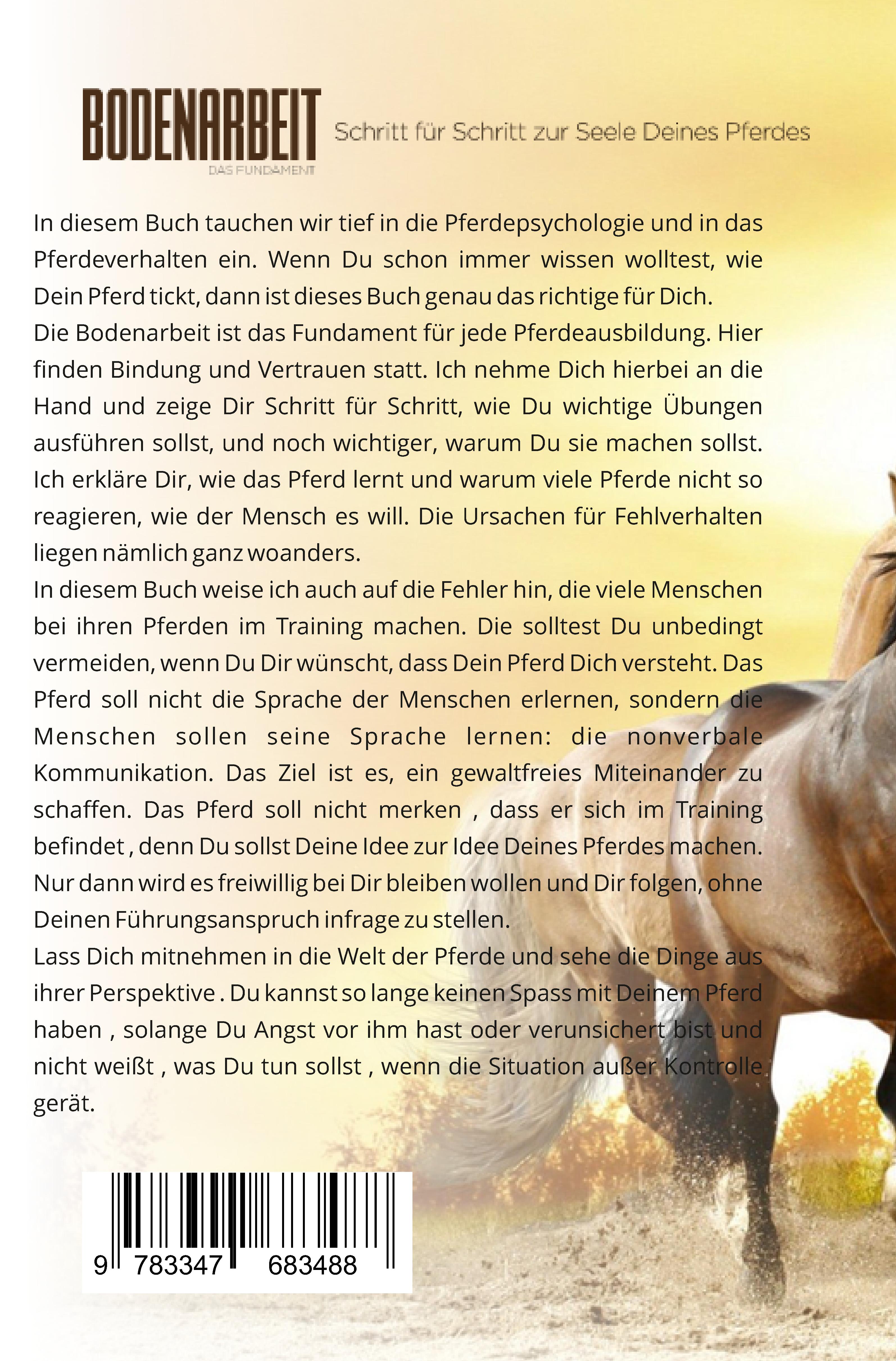 In diesem Buch tauchen wir tief in die Pferdepsychologie und in das Pferdeverhalten ein. Wenn Du schon immer wissen wolltest, wie Dein Pferd tickt, dann ist dieses Buch genau das richtige für Dich. Die Bodenarbeit ist das Fundament für jede Pferdeausbildung. Hier finden Bindung und Vertrauen statt. Ich nehme Dich hierbei an die Hand und zeige Dir Schritt für Schritt, wie Du wichtige Übungen ausführen sollst, und noch wichtiger, warum Du sie machen sollst. Ich erkläre Dir, wie das Pferd lernt und warum viele Pferde nicht so reagieren, wie der Mensch es will. Die Ursachen für Fehlverhalten liegen nämlich ganz woanders. In diesem Buch weise ich auch auf die Fehler hin, die viele Menschen bei ihren Pferden im Training machen. Die solltest Du unbedingt vermeiden, wenn Du Dir wünscht, dass Dein Pferd Dich versteht. Das Pferd soll nicht die Sprache der Menschen erlernen, sondern die Menschen sollen seine Sprache lernen: die nonverbale Kommunikation. Das Ziel ist es, ein gewaltfreies Miteinander zu schaffen. Das Pferd soll nicht merken, dass er sich im Training befindet, denn Du sollst Deine Idee zur Idee Deines Pferdes machen. Nur dann wird es freiwillig bei Dir bleiben wollen und Dir folgen, ohne Deinen Führungsanspruch infrage zu stellen. Lass Dich mitnehmen in die Welt der Pferde und sehe die Dinge aus ihrer Perspektive. Du kannst so lange keinen Spaß mit Deinem Pferd haben, solange Du Angst vor ihm hast oder verunsichert bist und nicht weißt, was Du tun wenn die Situation außer Kontrolle gerät.