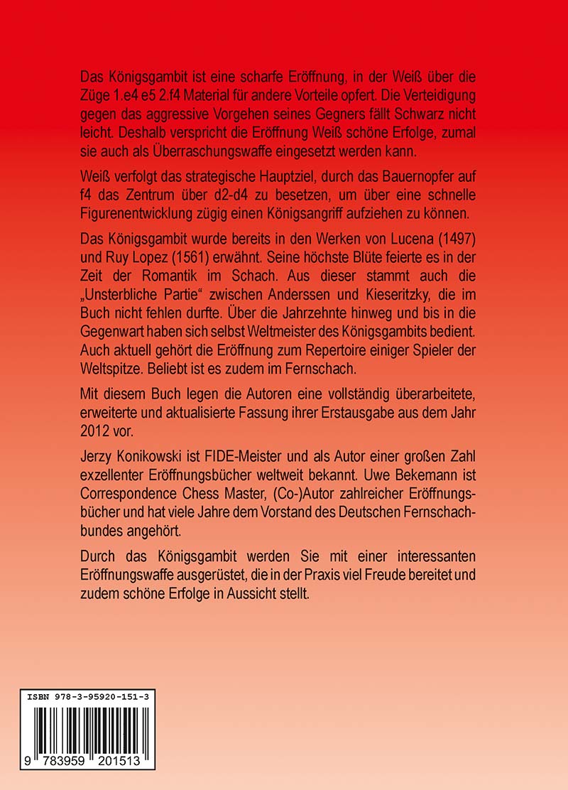 Das Königsgambit ist eine scharfe Eröffnung, in der Weiß über die Züge 1.e4 e5 2.f4 Material für andere Vorteile opfert. Die Verteidigung gegen das aggressive Vorgehen seines Gegners fällt Schwarz nicht leicht. Deshalb verspricht die Eröffnung Weiß schöne Erfolge, zumal sie auch als Überraschungswaffe eingesetzt werden kann.Weiß verfolgt das strategische Hauptziel, durch das Bauernopfer auf f4 das Zentrum über d2-d4 zu besetzen, um über eine schnelle Figurenentwicklung zügig einen Königsangriff aufziehen zu können.Das Königsgambit wurde bereits in den Werken von Lucena (1497) und Ruy Lopez (1561) erwähnt. Seine höchste Blüte feierte es in der Zeit der Romantik im Schach. Aus dieser stammt auch die "Unsterbliche Partie" zwischen Anderssen und Kieseritzky, die im Buch nicht fehlen durfte. Über die Jahrzehnte hinweg und bis in die Gegenwart haben sich selbst Weltmeister des Königsgambits bedient. Auch aktuell gehört die Eröffnung zum Repertoire einiger Spieler der Weltspitze. Beliebt ist es zudem im Fernschach.Mit diesem Buch legen die Autoren eine vollständig überarbeitete, erweiterte und aktualisierte Fassung ihrer Erstausgabe aus dem Jahr 2012 vor.Jerzy Konikowski ist FIDE-Meister und als Autor einer großen Zahl exzellenter Eröffnungsbücher weltweit bekannt. Uwe Bekemann ist Correspondence Chess Master, (Co-)Autor zahlreicher Eröffnungsbücher und hat viele Jahre dem Vorstand des Deutschen Fernschachbundes angehört.Durch das Königsgambit werden Sie mit einer interessanten Eröffnungswaffe ausgerüstet, die in der Praxis viel Freude bereitet und zudem schöne Erfolge in Aussicht stellt.