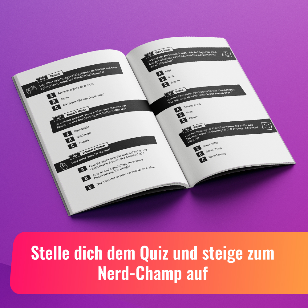 Kannst du zum Champion der Nerds aufsteigen?Als Party-Spiel oder zum Testen des eigenen Wissens - Mit diesem Quiz haben Geeks Spaß. Wer kann am Ende mit echtem Nerd-Wissen glänzen? Stelle dich der Herausforderung aus über 330 Fragen in den Kategorien Videospiele, Filme, Serien, Anime und mehr.Zahlreiche Fragen aus 5 KategorienHier treffen erstaunliche Fragen auf verblüffende Antworten. Skurril, lustig und informativ - diese Antworten sorgen für Aha-Momente. Welche Disney-Figur wird in China seit 2017 zensiert?Welcher PC-Klassiker enthielt als Easter Egg das geheime Kuh-Level?Welche deutsche Stadt diente als Inspiration für den Schauplatz im Erfolgsanime Attack on Titan?Welcher Film war der erste, der weltweit mehr als 2 Milliarden Dollar umsetzen konnte?Was haben Jean-Luc Picard aus Star Trek und Sherlock Holmes gemeinsam?Quizze dich an die SpitzeImmer griffbereit und übersichtlich gestaltet, bietet dieses Buch jederzeit die perfekte Gelegenheit für ein schnelles Quiz-Spiel. Egal ob allein auf Highscore-Jagd oder mit Freunden im Rennen um den Nerd-Pokal.Zwei in Eins: Quiz und unnützes WissenIm Lösungsteil erwarten dich ausführliche Antworten, die für Aha-Momente sorgen und spannende Fun-Facts bereithalten. So ist das Quiz-Buch nicht nur ein spaßiger Fragenkatalog, sondern auch eine echte Wissenssammlung.Highlights: Über 330 Fragen aus 5 KategorienHerausforderung für Einzel- oder Gruppen-QuizzerÜbersichtlicher Aufbau mit separatem LösungsteilÜberraschende Antworten sorgen für Aha-MomenteSkurril, lustig und interessant - das sind keine Standard-FragenOb für dich selbst oder als Geschenk: Mit diesem Quiz erleben Nerds - und solche, die es werden wollen - unterhaltsame Momente.
