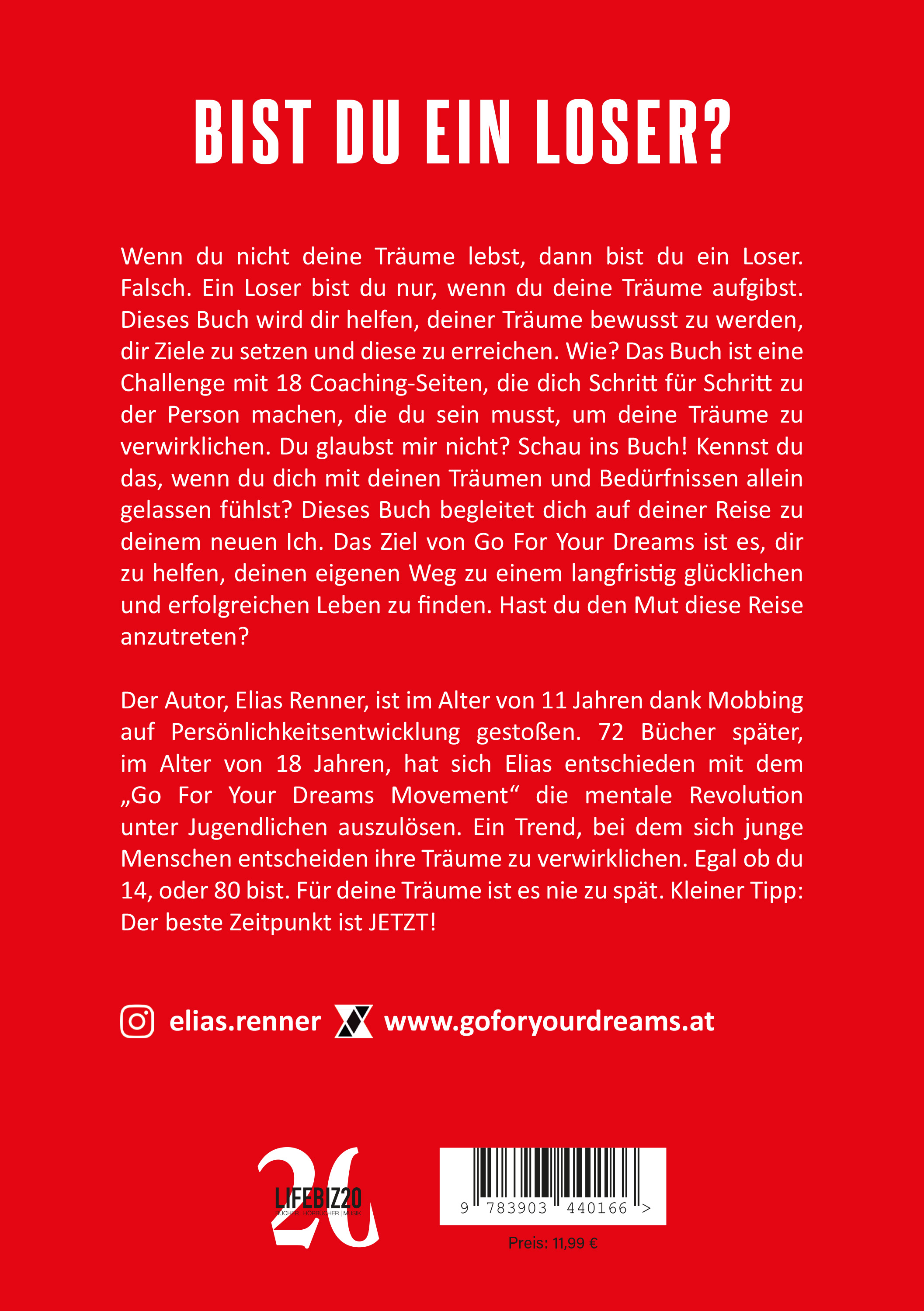 Elias Jakob Renner ist mit 19 Jahren einer der jüngsten Autoren Österreichs. Als er noch ein Baby war, wurde klar, dass etwas mit seinen Augen nicht stimmte. Medizinische Untersuchungen ergaben, dass sich seine Sehkraft auf etwa 5% beläuft, was seine Eltern schockierte. Wird er in die Schule gehen können? Doch seine Mutter, die ihn im Alter von 15 Jahren zur Welt brachte, schreckte vor keiner Herausforderung zurück. Da er auf kurze Distanz etwas besser sieht, lernte er im Alltag mit seiner Sehschwäche klarzukommen. Doch in der Hauptschule kam es dann zu Mobbing. Neben Bemerkungen wie „Maulwurf“, wurde er auch herumgeschubst. Sein Tiefpunkt war der Wendepunkt, der alles verändern sollte. Als er eines Tages weinend auf der Couch saß, stellte er sich folgende Frage: „Bin ich weniger wert?“. Um diese Frage zu beantworten, durchsuchte er das Internet und stieß auf Persönlichkeitsentwicklung. Ihm wurde klar, dass er nicht weniger wert ist, nur weil andere ihn runtermachen. Im Alter von 11 Jahren traf er die Entscheidung, die volle Verantwortung für sein Leben zu übernehmen. Schon früh begann er dann Bücher zum Thema Selbstbewusstsein, Motivation, Psychologie, Disziplin und mentaler Gesundheit zu lesen. Dieses Wissen schenkte ihm Selbstbewusstsein und befähigte ihn Mobbing loszuwerden. Er kam zur Erkenntnis, dass nicht nur er Herausforderungen im Bereich mentaler Gesundheit hatte, was eine Studie der Donau-Krems Universität bestätigt. Fast jeder zweite Jugendliche leidet unter depressiven Symptomen. Als ihm dies bewusst wurde, entschied er sich die Non-Profit Organisation Go for your dreams ins Leben zu rufen, die Persönlichkeitsentwicklungs-Workshops an Schulen bringt. Das Ziel der Organisation ist ein fixes Schulfach „Persönlichkeitsentwicklung und mentale Gesundheit“ österreichweit einzuführen. In einem Interview sagte Elias folgendes: „Wir sehen, dass die Fitnessstudios mehr und mehr von Jugendlichen überflutet werden. Zuerst der Körper, dann der Geist. Es wird in den nächsten Jahren ein Umdenken geben und Persönlichkeitsentwicklung wird zum Trend werden. Jugendliche, die in Klarheit, in Frieden und glücklich leben, werden Kinder erziehen, die uns alle übertreffen werden. Wir können uns das Ausmaß und die Wichtigkeit von mentaler Bildung gar nicht vorstellen. Es ist unsere Verantwortung, fürs Wohlbefinden kommender Generationen zu sorgen. Wir müssen jetzt handeln.“ Heute studiert Elias Psychologie, hält Vorträge und baut die Non-Profit Organisation Go for your dreams auf. Er freut sich, Kräfte zu vereinen. Melde dich gerne unter +436644500270