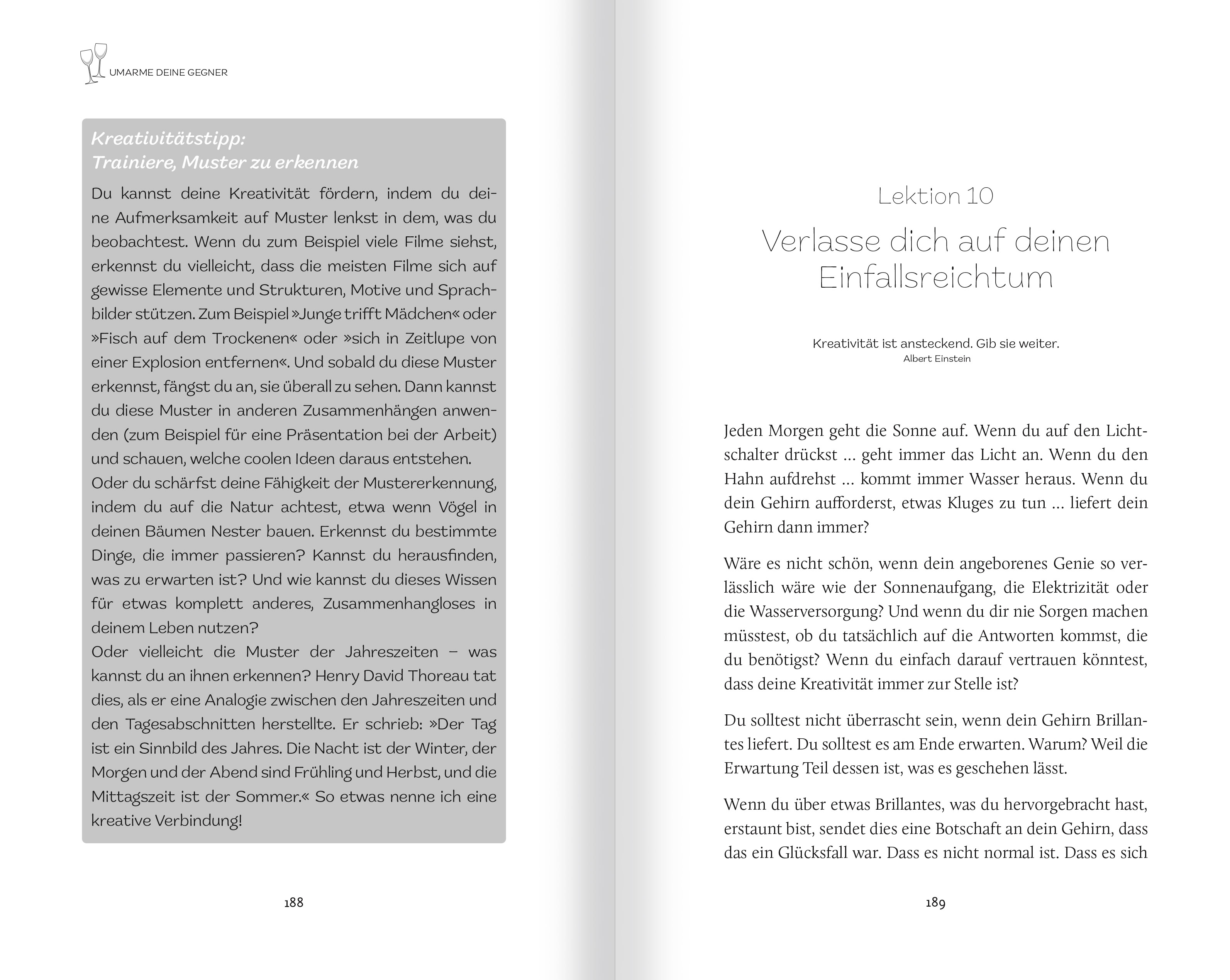 INHALTEinleitungSo benützt du dieses BuchTEIL I: NUTZE DEINE ANGEBORENE GENIALITÄTKapitel 1: Selbstgespräche für das Leben deiner Träume- Positive Selbstgespräche für das fantastischste Leben- Die emotionale Verbindung- Die Macht der Selbstliebe Kapitel 2: Deine angeborene Genialität- Begrüße deine angeborene Genialität- Kreativität für ein absolut magisches LebenKapitel 3: Sechs Gaben der Kreativität1. Magisches Leben2. Schaffen von Optionen3. Problembehebung4. Langfristige Entspannung5. Sagenhafte Ideen und Fantasie6. Strahlende GesundheitKapitel 4: Wine Self-Talk- Warum unbedingt Wein?Kapitel 5: Durchführung des Wine-Self-Talk-Rituals- Tipps zum Schreiben deiner eigenen Wine-Self-Talk-Texte- Willkommen in deinem neuen kreativen LebenTEIL II: DIE WINE-SELF-TALK-TEXTELektion 1: Aufgeschlossenes, freies DenkenSelf-Talk-TextLektion 2: Aus dem Herzen heraus erschaffenSelf-Talk-TextLektion 3: Werde ein problemlösender NinjaSelf-Talk-TextLektion 4: Die Erlaubnis für esoterischen SchmusekursSelf-Talk-TextLektion 5: Kreatives SelbstvertrauenSelf-Talk-TextLektion 6: Glückliche Stunde in der HängematteSelf-Talk-TextLektion 7: Verliebe dich in deine reizvolle Intuition!Self-Talk-TextLektion 8: Deine Schatzkiste der FantasieSelf-Talk-TextLektion 9: Umarme deine GegnerSelf-Talk-TextLektion 10: Verlasse dich auf deinen EinfallsreichtumSelf-Talk-TextLektion 11: Kaskaden von IdeenSelf-Talk-TextLektion 12: Vorwärts scheiternSelf-Talk-TextLektion 13: Das Geheimnis der LangeweileSelf-Talk-TextLektion 14: Humor und KreativitätSelf-Talk-TextLektion 15: Feiere deine einmalige KreativitätChampagner-Self-Talk-TextZum Schluss