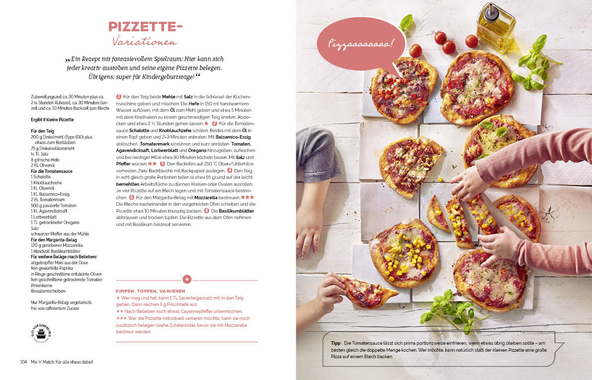 Denn das Thema Ernährung in der Familie liegt ihr sehr am Herzen. Es soll wirklich allen schmecken, soll schnell von der Hand gehen, abwechslungsreich sein und möglichst gesund sein, ohne zu nerven. Ganz ohne Tricks geht das natürlich nicht. Schließlich hat auch bei Nina zuhause jedes ihrer 4 Kinder seine eigenen Vorlieben beim Essen. Oberstes Gebot ist dabei für Nina, dass alles kann, und nichts muss. So sind ihre Rezepte für die ganze Familie sehr gut an individuelle Wünsche von klein und groß anpassbar, sodass jeder auf seine Kosten kommt, ohne dafür den ganzen Tag in der Küche zu stehen. Am wichtigsten ist es ihr, den Rest der Familie mit ihrer eigenen Begeisterung bei der Zubereitung anzustecken, egal ob beim Schnitzten von Obstgesichtern oder beim gemeinschaftlichen Grillen im Garten.