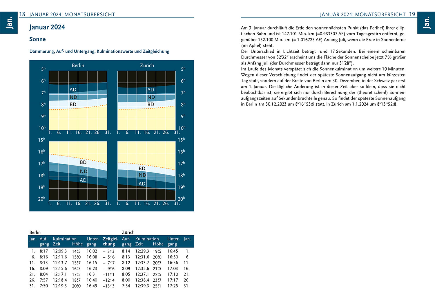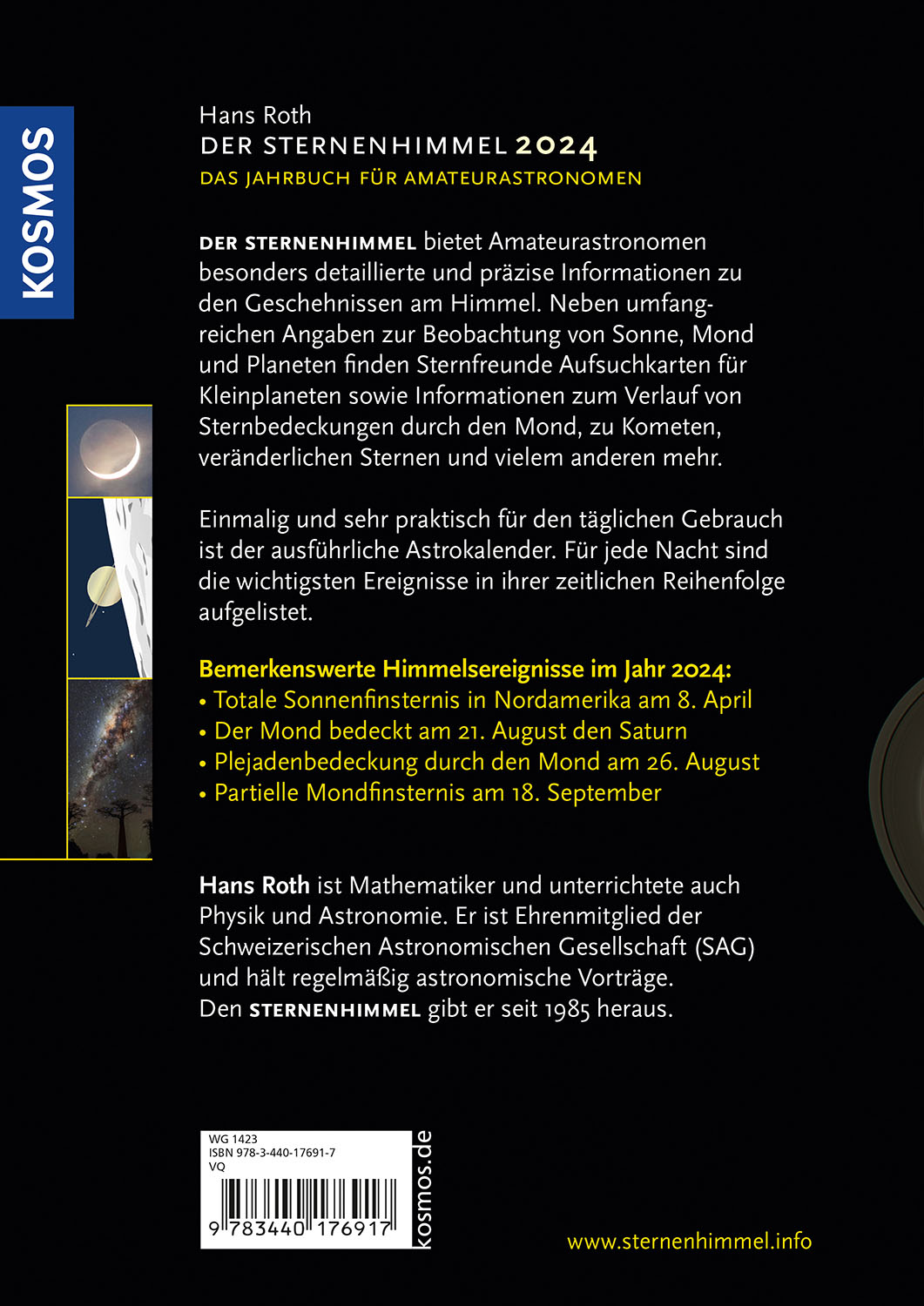 "Der Sternenhimmel" bietet Amateurastronomen besonders detaillierte und präzise Informationen zu den Geschehnissen am Himmel. Neben umfangreichen Angaben zur Beobachtung von Sonne, Mond und Planeten finden Sternfreunde Aufsuchkarten für Kleinplaneten sowie Informationen zum Verlauf von Sternbedeckungen durch den Mond, zu Kometen, veränderlichen Sternen und vielem anderem mehr. Besonders praktisch für den täglichen Gebrauch ist der ausführliche Astrokalender - für jede Nacht sind die wichtigsten Ereignisse in ihrer zeitlichen Reihenfolge aufgelistet. Die Highlights 2024: Planetentreffen von Mars und Jupiter am 15. August, partielle Mondfinsternis am 18. September.
