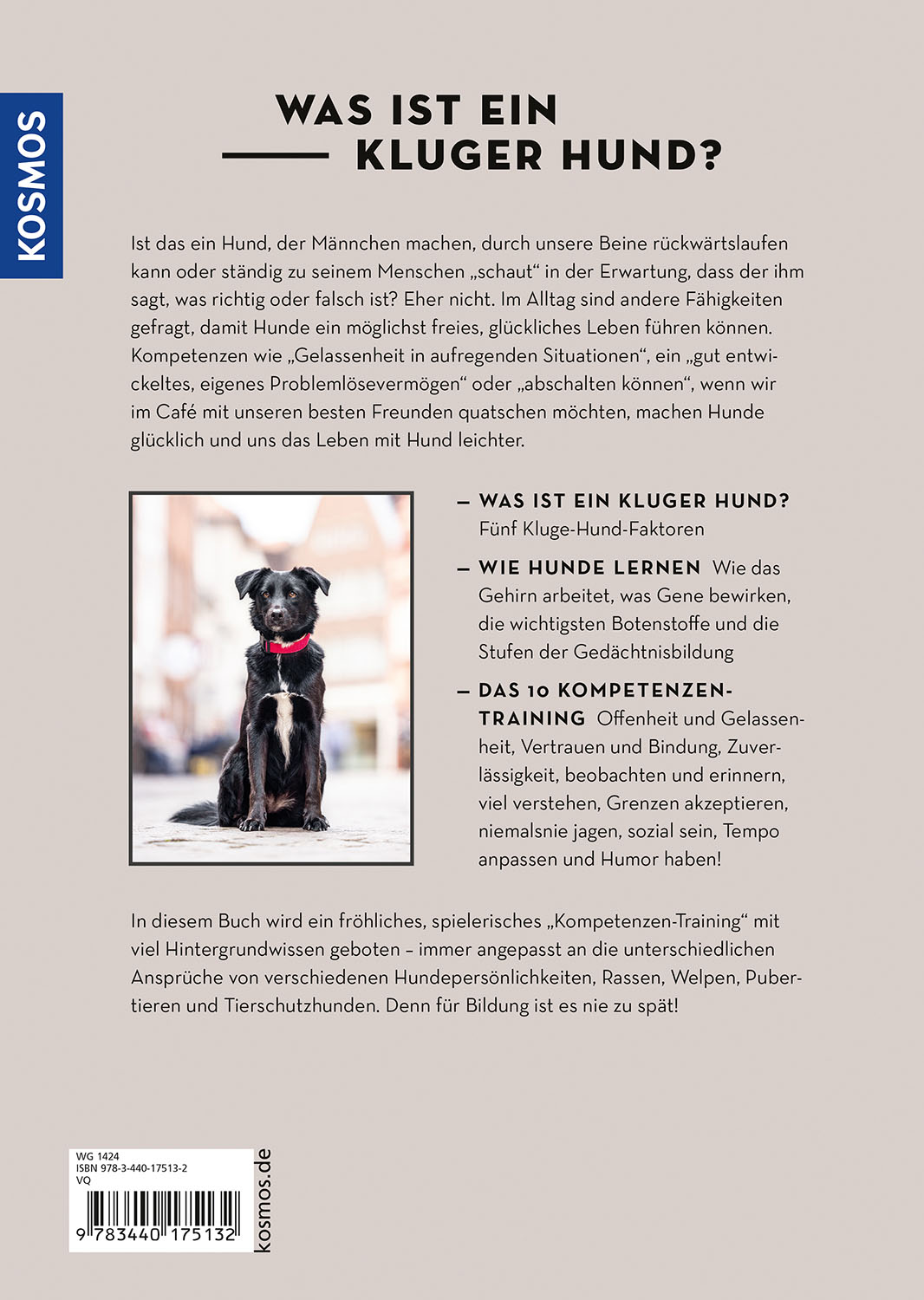 Kluge Hunde sind glückliche, alltagstaugliche und gern gesehene Begleiter. Doch wie wird mein Hund klüger und ausgeglichener und was kann ich als Besitzer dafür tun? Die Hundeexpertin Kate Kitchenham erklärt, wie Hunde lernen und wie man die wichtigen Kompetenzen seines Hundes trainiert. Dazu gehören Offenheit und Gelassenheit, Vertrauen, Zuverlässigkeit, Sozialverträglichkeit, selbstständiges Denken und Grenzen akzeptieren. Bei allen Kompetenzübungen wird erklärt, für welche Hunde sie sich anbieten und was sie im Alltag für positive Folgen für das Zusammenleben haben. Sämtliche Step-by-Step Trainings lassen sich gut in den Alltag integrieren. Sie verbessern Einfühlungsvermögen, Konzentration, Impulskontrolle und Selbstbewusstsein des Hundes und stärken die Bindung im Mensch-Hund-Team.