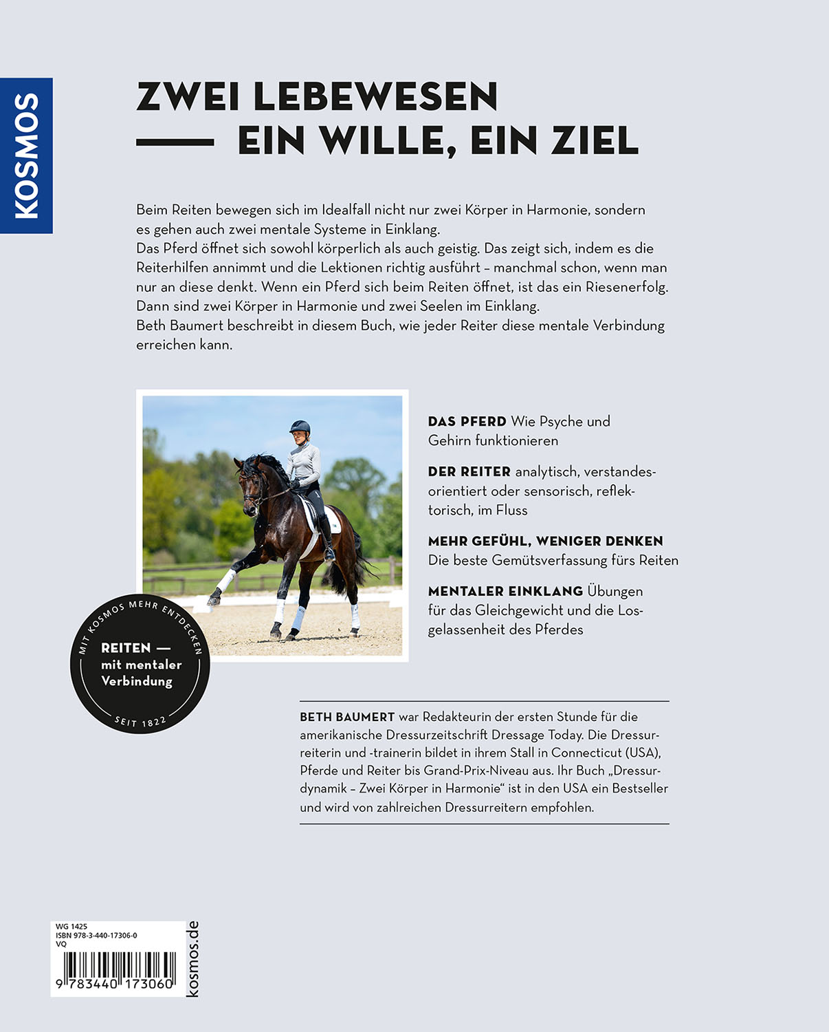 Besseres Reiten ist nicht nur eine Frage der körperlichen Harmonie, auch die „Seelen“ von Reiter und Pferd sollten im Einklang sein. Beth Baumert erklärt, wie unterschiedlich der Verstand von Pferd und Mensch funktioniert und zeigt Lernprinzipien und Techniken, durch die beide zusammenkommen. Das praktische Mentaltraining fördert die Losgelassenheit und Ausgeglichenheit beim Pferd und ist eine wertvolle Wissensquelle für Reiterinnen und Reiter, die nach größtmöglicher geistiger und emotionaler Harmonie mit dem Pferd streben.