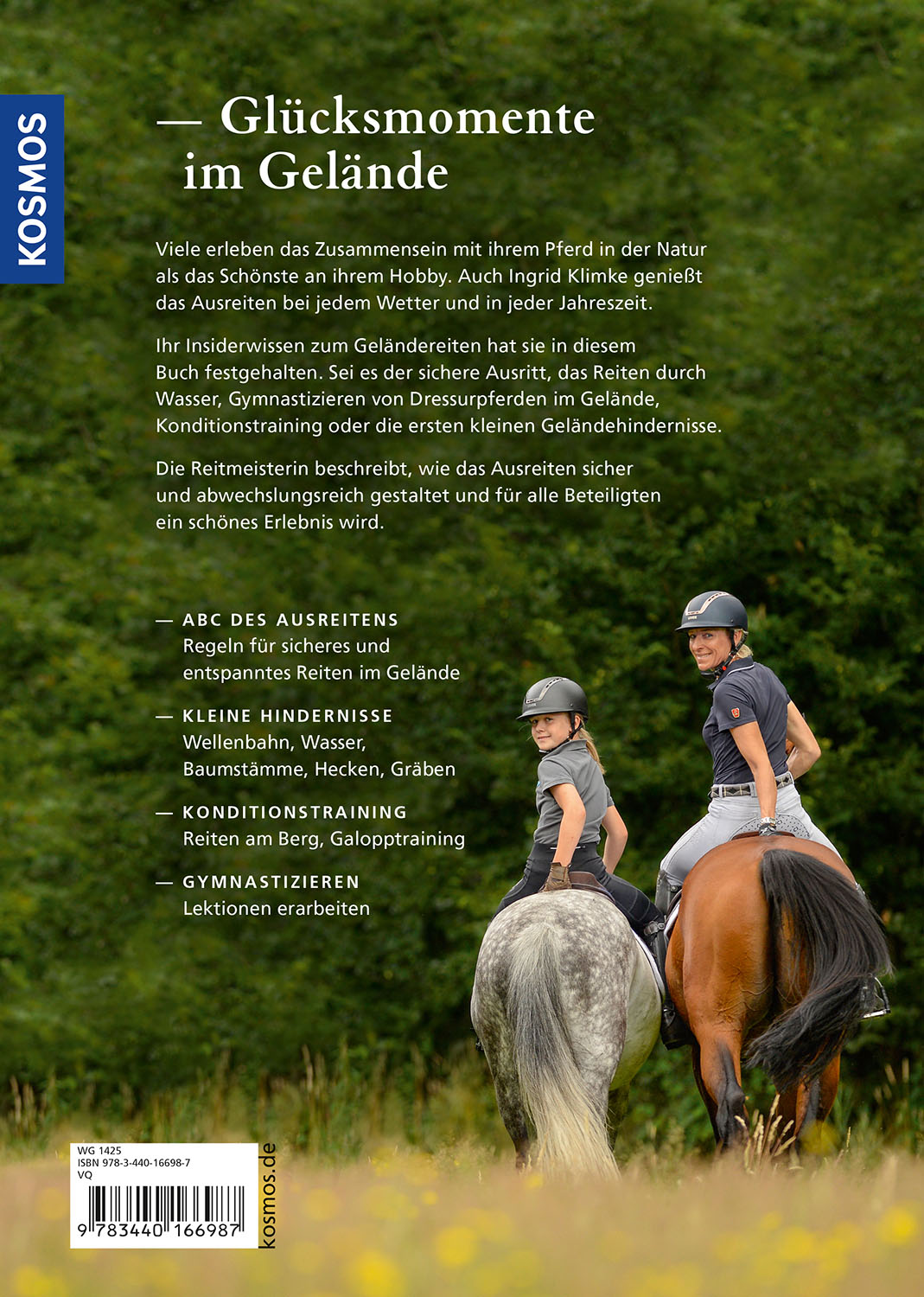 Vielseitigkeitsreiterin Ingrid Klimke ist DIE Expertin für das Reiten im Gelände. In diesem Buch gibt sie ihr komplettes Wissen weiter: sei es der erste Ausritt, das Reiten durch Wasser oder am Berg, das Gymnastizieren im Gelände oder das erste Hindernis. Locker und positiv beschreibt sie, wie das Geländereiten sicher und abwechslungsreich gestaltet und für Pferd und Reiter zum Erfolgserlebnis wird. Wer die Geländeprüfung ablegen will, findet hier konkrete Trainingspläne für die optimale Vorbereitung. Das neue Standardwerk der Olympiasiegerin, mit vielen Insidertipps, die in keinem Lehrbuch stehen.