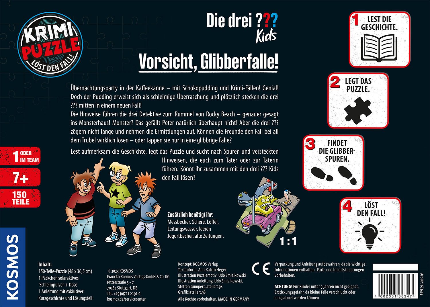 Spannende Krimi-Geschichte für Erstleserinnen und Erstleser mit den drei ??? Kids. Ein Schleim-Monster in Rocky Beach? Die Ermittlungen führen Die drei ??? zum Monsterhaus auf dem Rummel. Gemeinsam mit Justus Jonas, Peter Shaw und Bob Andrews tauchen Kinder ab sieben Jahren ein in die exklusive Kurzgeschichte. Wie ein echter Detektiv einen spannenden Fall lösen! Dafür legen sie allein oder im Team das Puzzle. Was genau ist passiert? Wer ist verdächtig? Puzzleteil für Puzzleteil erscheint der Tatort. Manche Hinweise verstecken sich im Wimmelbild und sind nicht sofort sichtbar. Tolles Extra im Krimi-Spiel: glibbriges Schleimpulver zum selbst anrühren mit Dose zum Aufbewahren.