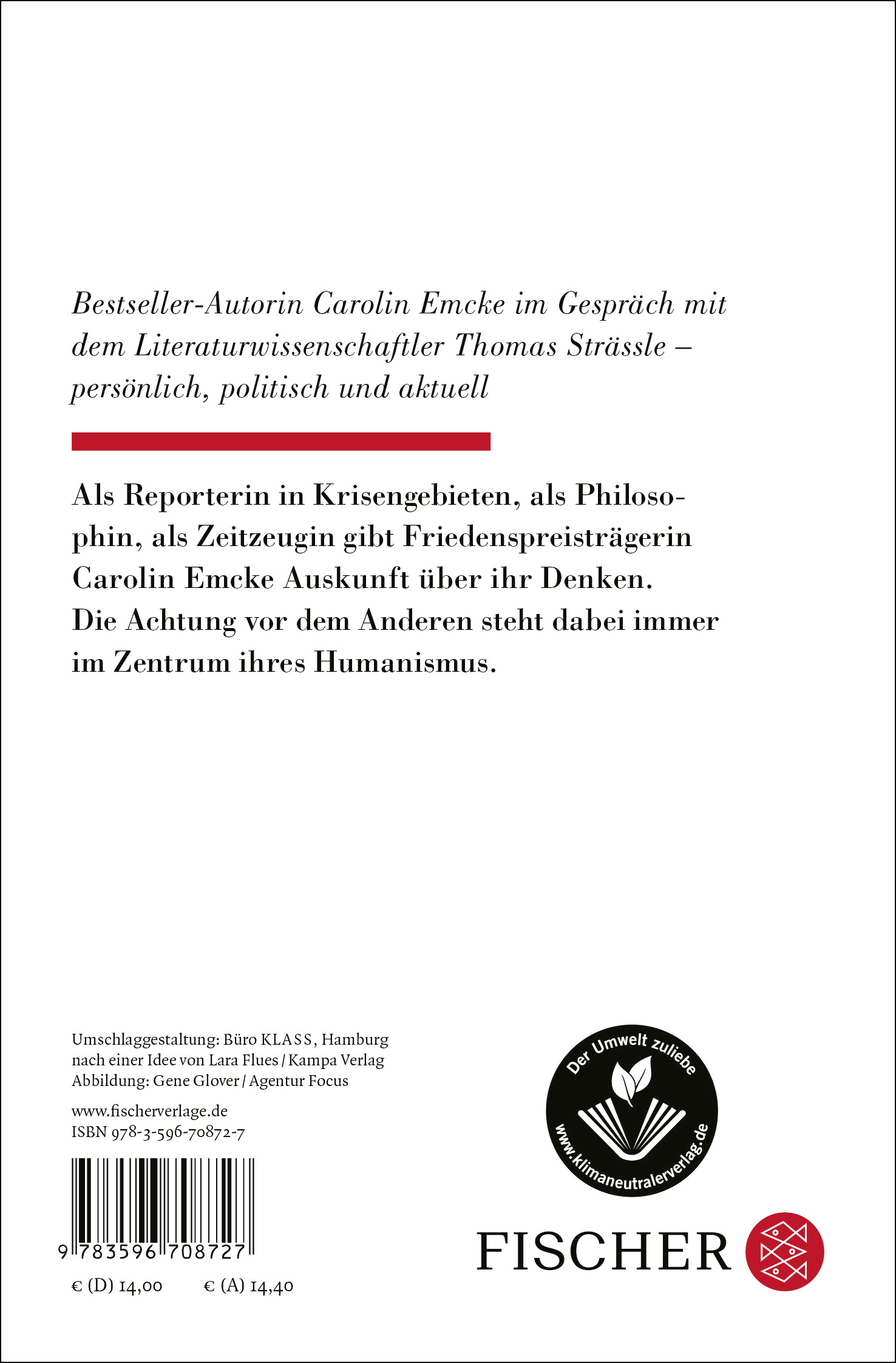 Carolin Emcke, geboren 1967, studierte Philosophie in London, Frankfurt/Main und Harvard. Sie promovierte über den Begriff »kollektiver Identitäten«.Von 1998 bis 2013 bereiste Carolin Emcke weltweit Krisenregionen und berichtete darüber. 2003/2004 war sie als Visiting Lecturer für Politische Theorie an der Yale University.Sie ist freie Publizistin und engagiert sich immer wieder mit künstlerischen Projekten und Interventionen, u.a. die Thementage »Krieg erzählen« am Haus der Kulturen der Welt. Seit über zehn Jahren organisiert und moderiert Carolin Emcke die monatliche Diskussionsreihe »Streitraum« an der Schaubühne Berlin. Für ihr Schaffen wurde sie mehrfach ausgezeichnet, u.a. mit dem Theodor-Wolff-Preis, dem Otto-Brenner-Preis für kritischen Journalismus, dem Lessing-Preis des Freistaates Sachsen und dem Merck-Preis der Deutschen Akademie für Sprache und Dichtung. 2016 erhielt sie den Friedenspreis des Deutschen Buchhandels. Bei S. Fischer erschienen ›Von den Kriegen. Briefe an Freunde‹, ›Stumme Gewalt. Nachdenken über die RAF‹, ›Wie wir begehren‹, ›Weil es sagbar ist: Über Zeugenschaft und Gerechtigkeit‹ sowie ›Gegen den Hass‹.»Emckes Texte halten die Frage lebendig, ob es gleichgültig ist, wenn Menschen übertönt werden und verstummen, während andere beredt ihre Macht ausüben.«Elisabeth von Thadden, Die Zeit»Gut also, dass mit dem Friedenspreis […] eine Autorin ausgezeichnet wird, die erfolgreich an der moralischen Aufladung der politischen Auseinandersetzung des öffentlichen Geredes arbeitet.«Jens Bisky, Süddeutsche ZeitungLiteraturpreise:»Das Politische Buch« der Friedrich-Ebert-Stiftung (2005)Förderpreis des Ernst-Bloch-Preises (2006)Theodor-Wolff-Preis in der Kategorie Essay für den Beitrag »Stumme Gewalt«, erschienen im »ZEITmagazin« vom 06.09.2007 (2008)Otto Brenner Preis für kritischen Journalismus 2010Deutscher Reporterpreis 2010 für die beste ReportageJournalistin des Jahres 2010 (ausgezeichnet vom ›medium magazin‹)Journalistenpreis für Kinderrechte der Ulrich-Wickert-Stiftung 2012Johann-Heinrich-Merck-Preis der Deutschen Akademie für Dichtung und Sprache (2014)Lessing-Preis des Freistaats Sachsen (2015)Preis der Lichtenberg Poetik-Dozentur (2015)Friedenspreis des Deutschen Buchhandels (2016)