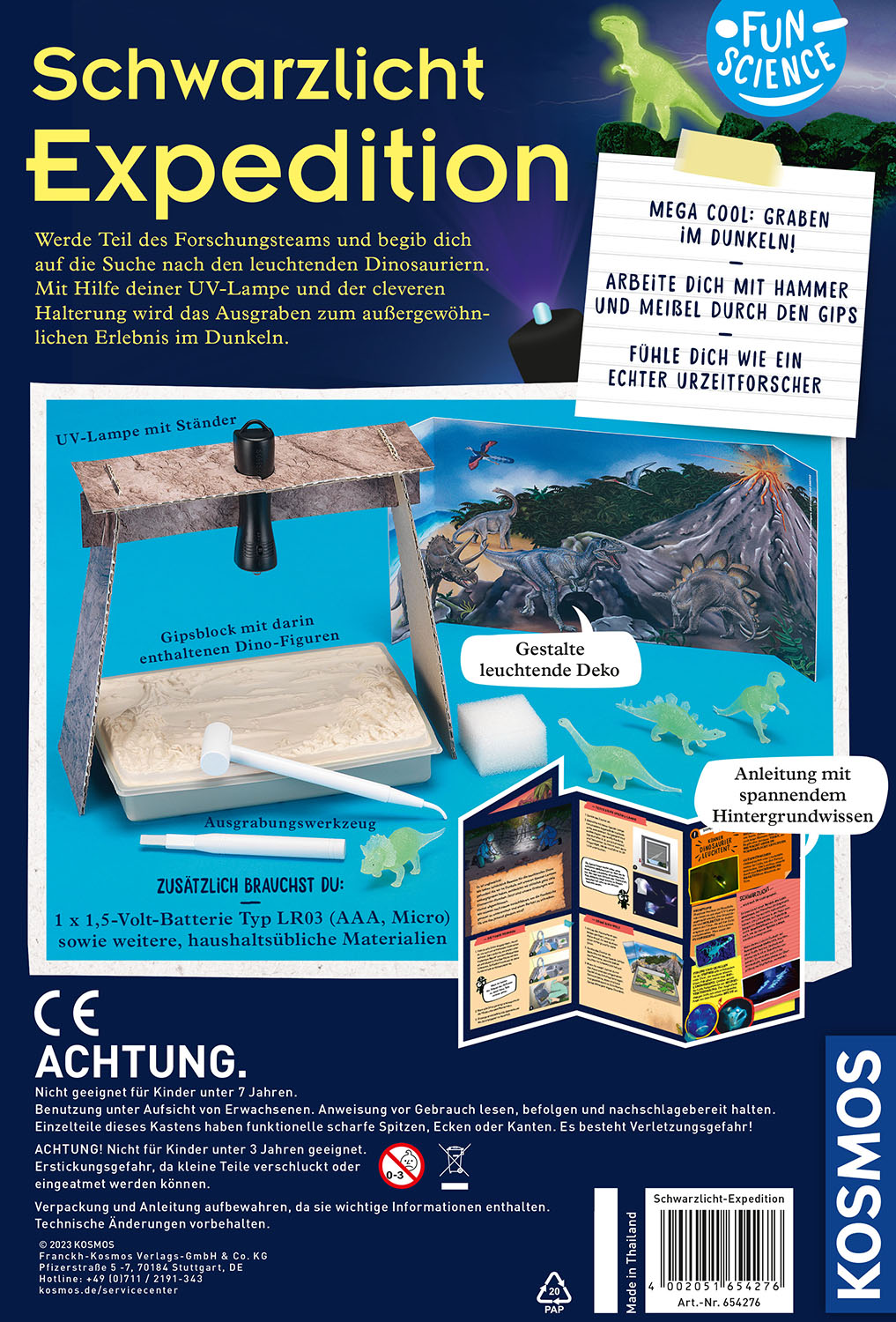 Ausgrabung mit Herzklopfen: Denn diese Dino-Figuren sind nachtleuchtend und können nur im Dunkeln und im Licht der speziellen UV-Lampe gefunden werden! Ob Stegosaurus, Tyrannosaurus Rex oder ihre Artverwandten - sie alle liegen im Gipsblock verborgen und müssen mit Hammer und Meißel Stück für Stück freigelegt werden. Damit die UV-Lampe bei der archäologischen Arbeit nicht im Weg ist, basteln die Kinder gleich zu Anfang einen praktischen Ständer, der die Ausgrabungsstätte von oben beleuchtet. Der zusätzliche Aufsteller bietet ein urzeitliches Panorama und setzt die Dino-Schar auch nach der Ausgrabung noch toll in Szene. Das KOSMOS Ausgrabungsset eröffnet selbst erfahrenen Dino-Fans zwischen 7 und 11 Jahren noch ein neues urzeitliches Erlebnis.Dieses Abenteuer beginnt, sobald es dunkel wird! Denn mithilfe ihrer speziellen UV-Lampe entdecken die Kinder immer mehr geheimnisvoll leuchtende Dinos in ihrer Ausgrabungsstätte! Damit die Hände frei bleiben für Hammer und Meißel, wird für die Lampe direkt ein praktischer Ständer gebaut. Mit dem UV-aktiven Panorama als Aufsteller kommt während und nach der Ausgrabung besonders urzeitliche Atmosphäre auf. Und so bieten die nachtleuchtenden Figuren von Stegosaurus, Tyrannosaurus Rex und Co. selbst erfahrene Fans ein ganz besonders Dino-Erlebnis.