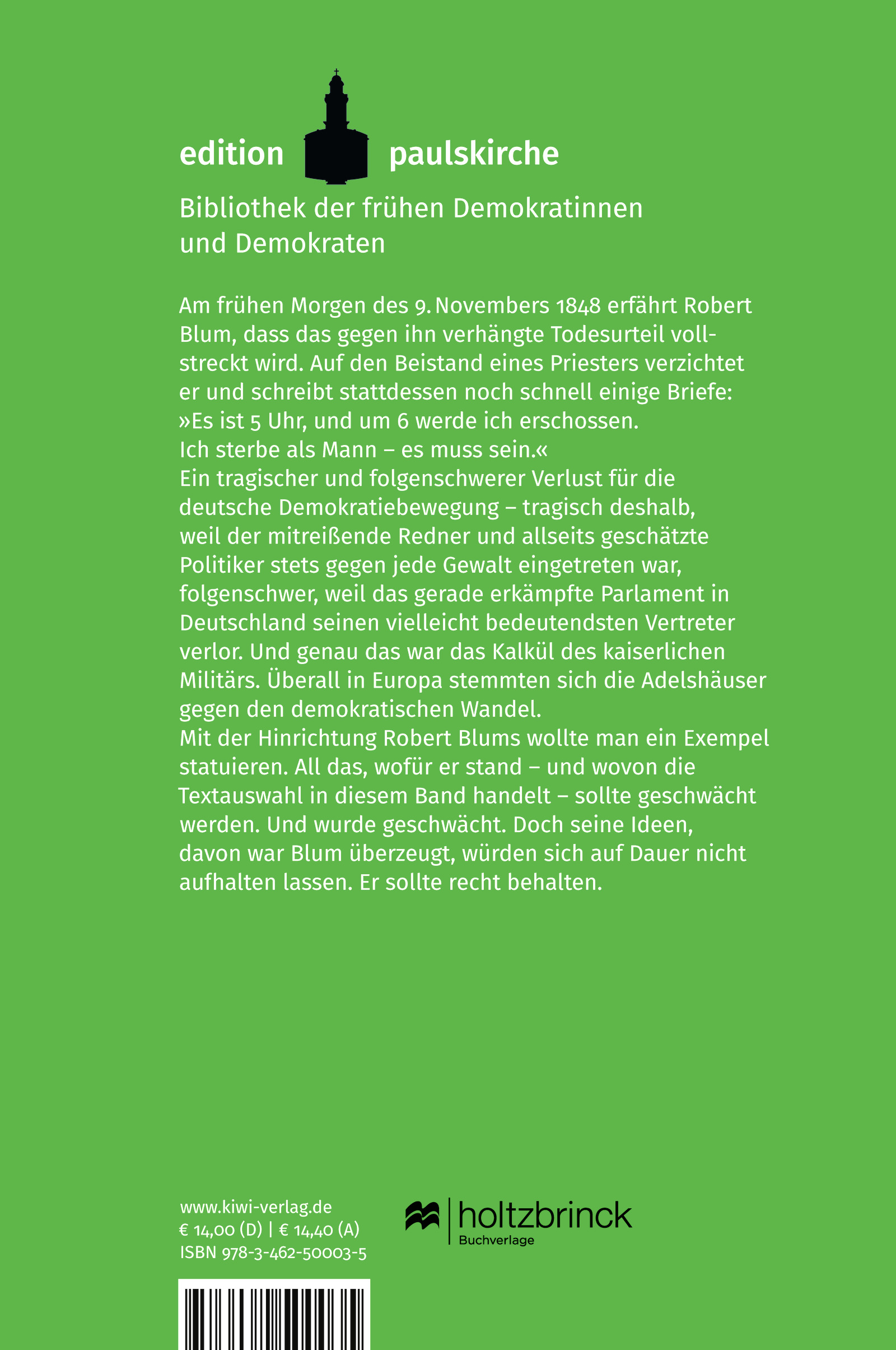 Der am 9. November 1848 in Wien für seine Ideale hingerichtete Robert Blum ist einer der wichtigsten Vertreter der deutschen Revolution. Blums Forderungen nach politischer Mitbestimmung der Bürger, sein Kampf für soziale Sicherheit, den freien Zugang zur Bildung, einen Rechtsstaat und eine parlamentarische Verfassung sind bis heute aktuell. Dennoch ist der Vordenker und Wegbereiter unserer freiheitlich-demokratischen Grundordnung nahezu aus dem kollektiven Gedächtnis verschwunden.