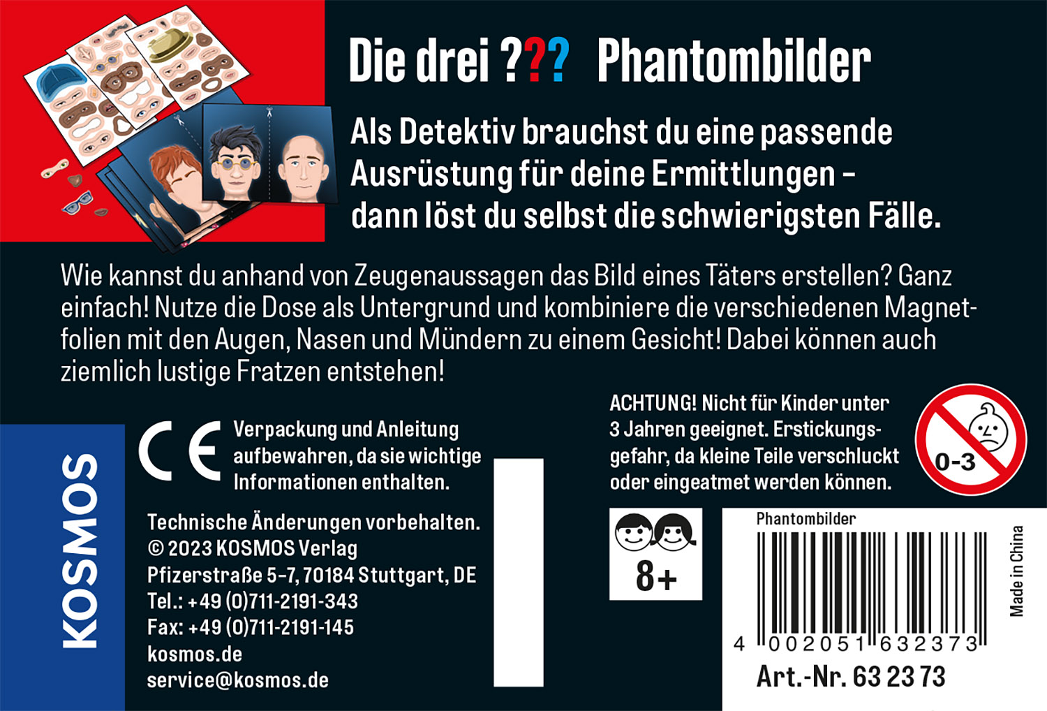 Detektiv-Set in cooler Metalldose. Phantombilder erstellen und Täter schnappen wie Die drei ???. Wie kannst du anhand von Zeugenaussagen ein möglichst realistisches Bild eines Täters erstellen? Ganz einfach! Nutze die Dose als Untergrund und kombiniere die verschiedenen Magnetfolien zu einem Gesicht! Die Magnetfolien enthalten unter anderem Augenbrauen, Augen, Ohren, Nasen, Münder und Kinnformen. Dabei können auch ziemlich lustige Fratzen entstehen!