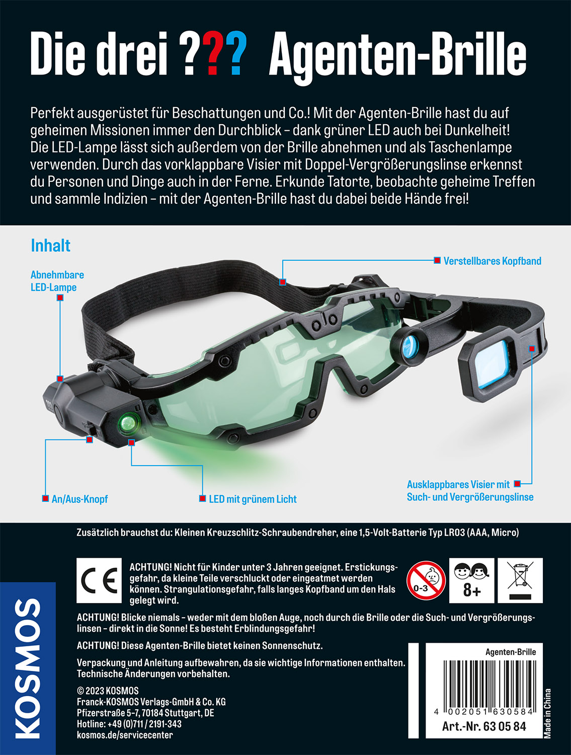 Coole Brille mit herunterklappbarem Linsenvisier. Mit abnehmbarer LED-Taschenlampe. Zwei farbige Vergrößerungs-Linsen verbessern die Sicht. Extra: Mit verstellbarem, elastischen Kopfband. Die ideale Ausrüstung für geheime Aufklärungs-Missionen. Empfohlenes Alter: ab 8 Jahren. Geheime Erkundungen im Dunkeln! Versteckten Hinweisen folgen, Ecken ausleuchten, Zeichen entziffern - diese coole Brille gehört in jeden Detektivkoffer! Mit den beiden vorklappbaren Vergrößerungslinsen werden kleinste Spuren sichtbar. Die abnehmbare Lampe mit grünem LED-Strahler lässt sich mit einem Klick am Brillenbügel befestigen. Mit einem elastischen Band verwandelt sie sich in eine Stirnlampe. Jetzt noch die Batterien einstecken und versteckte Sachen im Dunkeln entdecken, fast wie mit einem Nachtsichtgerät oder einer Nachtsichtbrille. Ein ideales Geschenk für Kinder ab 8 Jahren.