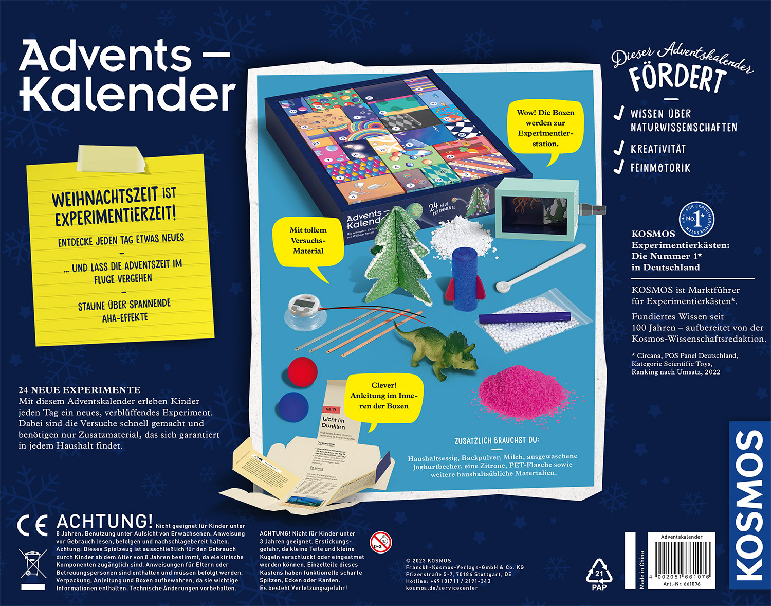 Hier warten 24 neue Durchstarter-Experimente auf Kinder von 8 bis 12 Jahren - der KOSMOS Adventskalender mit verblüffenden Aha-Momenten! In jeder der 24 liebevoll gestalteten Mini-Boxen steckt ein spannender Versuch - egal ob Physik, Biologie oder Chemie, hier begeistern tolle Phänomene! In wenigen Minuten führen die Kinder täglich ihre Versuche durch - ein alltagstauglicher Wissenskick, bei dem sogar Erwachsene oft noch Neues lernen können! Neugierig geworden? Dann verraten Zusatzinfos, was hinter den tollen Effekten steckt, und schnell wird klar: der Blick hinter die Kulissen unseres Alltags ist spannend! Ein verblüffender Adventskalender, der die Zeit bis Weihnachten ganz schnell verfliegen lässt! Hier warten neue Durchstarter-Experimente auf neugierige Kinder - der Adventskalender mit Wissenskick für die Weihnachtszeit 2023! Alle 24 Versuche sind innerhalb von wenigen Minuten durchgeführt und damit der perfekte Start in den Tag. Physik, Biologie und Chemie zum Anfassen - da staunt die ganze Familie über Alltags-Phänomene! Einfach jeden Morgen eine der kleinen Schachteln öffnen und verblüffen lassen, wohin sie führt! Haben die Versuche neugierig gemacht? Dann verraten Zusatzinfos noch viel mehr über die spannenden Effekte und liefern tolles Hintergrundwissen.