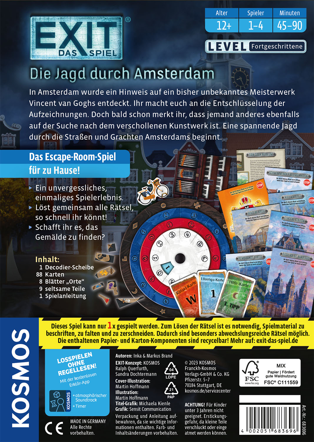 Aus der erfolgreichen Spielereihe "EXIT® - Das Spiel". Ein Escape-Room-Spiel für zu Hause. Spannende Jagd durch Amsterdam! 1-4 SpielerInnen lösen im Team clevere Rätsel und brauchen dazu Teamgeist, Kreativität und Kombinationsgeschick. Kooperatives Erlebnisspiel im Level: Fortgeschrittene. Mit Tutorial und Timer in der kostenlosen KOSMOS-Erklär-App. Mit und ohne App spielbar. Gesellschaftsspiel für Erwachsene, Fans von Live Escape Rooms und Familien ab 12 Jahren. Ideal als Partyspiel, Eventspiel und als Geburtstagsgeschenk. Da die Materialien für die außergewöhnlichen Rätsel verändert werden, nur einmal spielbar! Abenteuer in Amsterdam! Ein Brief mit dem Hinweis auf ein verschollenes Bild Vincent van Goghs taucht auf. Bei der Entschlüsselung der Rätsel muss sich das Team beeilen. Denn sie werden bei diesem EXIT® - Das Spiel für Fortgeschrittene durch die Straßen und Grachten Amsterdams verfolgt. Spannung pur!