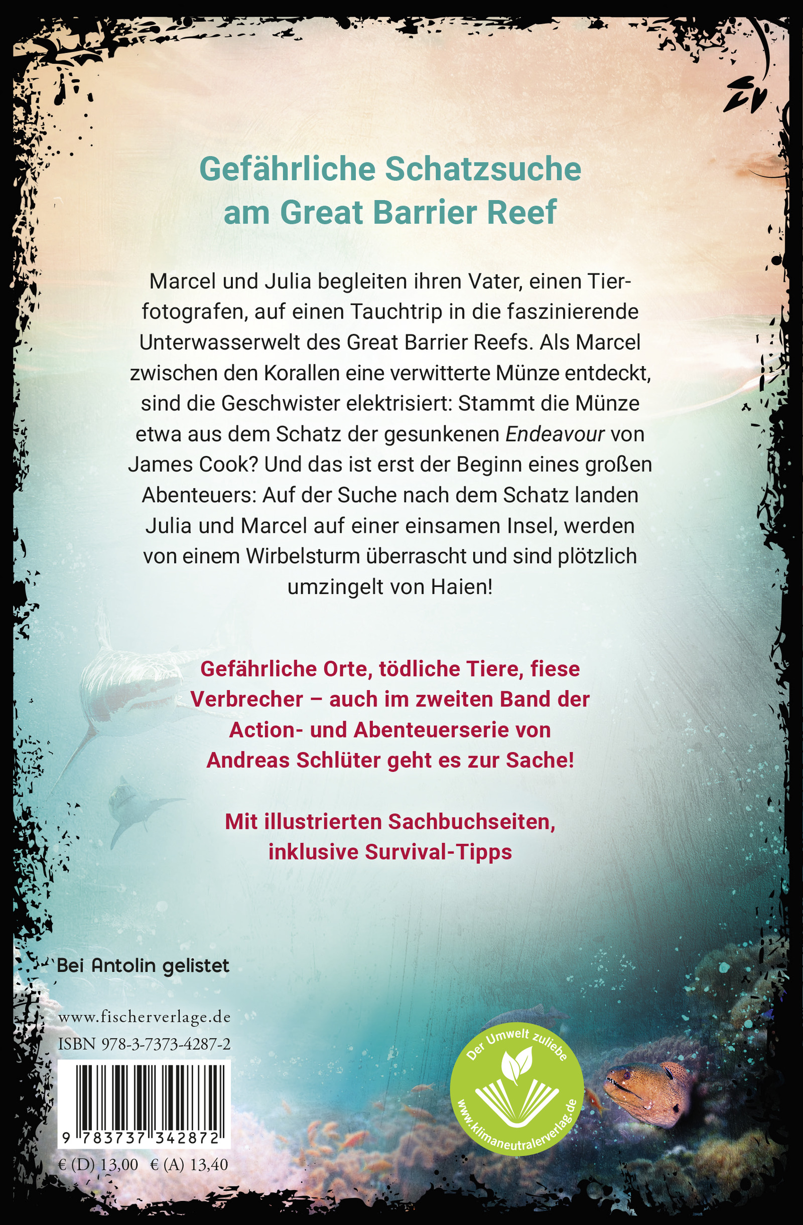 Marcel und Julia begleiten ihren Vater, einen erfolgreichen Tierfotografen, auf einen Tauchtrip in die faszinierende Unterwasserwelt des Great Barrier Reefs. Als Marcel zwischen den Korallen eine verwitterte Münze entdeckt, sind die Geschwister elektrisiert: Stammt die Münze etwa aus dem Schatz der gesunkenen Endeavour von James Cook? Und das ist erst der Beginn eines großen Abenteuers: Auf der Suche nach dem Schatz landen Julia und Marcel auf einer einsamen Insel, werden von einem australischen Wirbelsturm überrascht und sind plötzlich umzingelt von Haien!