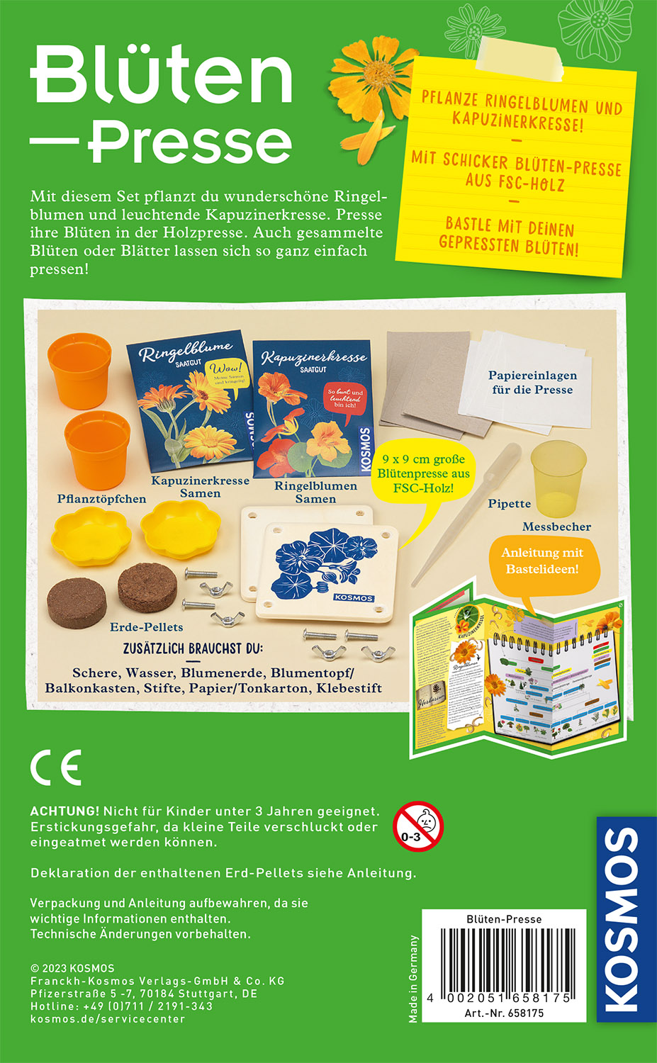 Wunderschöne Blumen selbst züchten, sammeln und haltbar machen: Kinder zwischen 6 und 12 Jahren pressen Blüten, Blätter und kleine Pflanzen und erforschen sie. Die Blütenpresse zum Mitnehmen: handlich, aus FSC-zertifiziertem Holz und 9x9 cm groß ist sie perfekt für Entdeckungsrundgänge in der Natur und kinderleicht zu benutzen. Das Komplett-Set enthält Anzuchttöpfchen, Erde und Samen von Ringelblume und Kapuzinerkresse, die von den Kindern selbst angepflanzt werden. Die gepressten Blüten als Deko, im Herbarium oder zum Basteln nutzen? Na klar! Die Anleitung enthält eine tolle Bastelidee für die gepressten Trockenblumen und zeigt, wie ein Herbarium angelegt wird. Mit der KOSMOS Blütenpresse gehen Kinder immer wieder auf Entdeckungsreise in der Natur und machen ihre gesammelten Pflanzen-Schätze mit der Presse für lange Zeit haltbar. Bunte Blüten, die nie verwelken! Mit der handlichen Blütenpresse aus FSC-Holz entstehen aus Ringelblumen und Kapuzinerkresse wunderschöne Trockenblumen. Die Blumen werden dafür mit dem enthaltenen Anzucht-Set selbst herangezogen und anschließend gepresst. Ob blumige Grußkarten oder das erste selbst angelegte Pflanzen-Herbarium - für Kinder ein spannendes Projekt. Doch bevor die gepressten Blüten oder Blätter für Bastelprojekte genutzt werden, nehmen die Kinder die Pflanzen ganz genau unter die Lupe: Wie ist die Blüte aufgebaut und welche Strukturen hat ein Blatt? Die Anleitung erklärt die wichtigsten Details und zeigt, wie Pflanzen durch das Pressen haltbar gemacht werden. Und wer noch nicht genug hat, schnappt sich einfach die Blütenpresse und sammelt in der Natur weitere Pflanzen zum Pressen. Ein tolles Mitbringsel von KOSMOS.