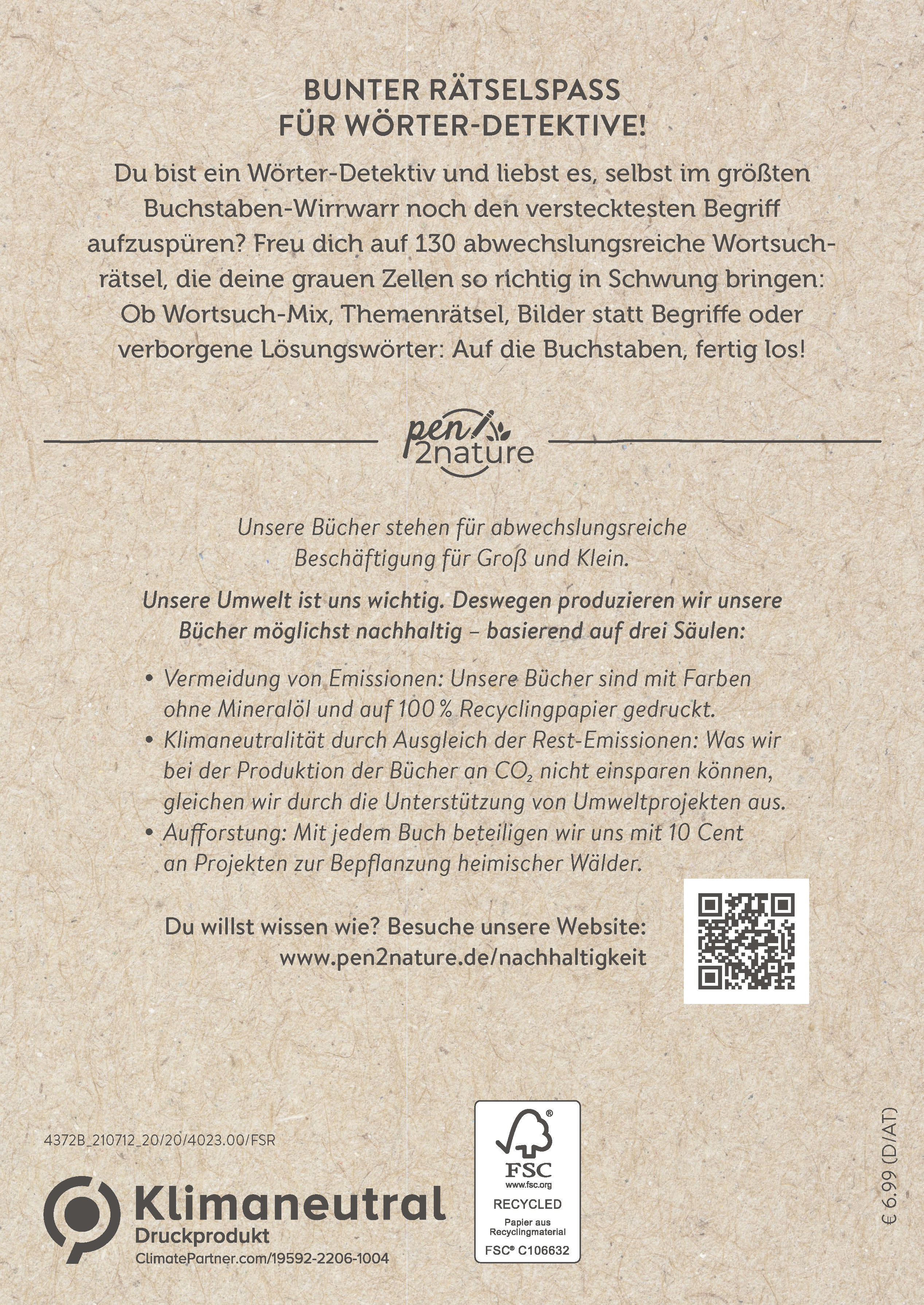 Für mehr Nachhaltigkeit im Alltag: Dieses Buch wurde mit Farben ohne Mineralöl und auf 100 % Recyclingpapier gedruckt. Rest-Emissionen werden durch die Unterstützung von Umweltprojekten ausgeglichen. Zusätzlich beteiligt sich der Verlag pen2nature mit jedem Buch mit 10 Cent an Projekten zur Bepflanzung heimischer Wälder. Wie genau das alles funktioniert? Auf seiner Website informiert der Verlag ausführlich und transparent darüber.