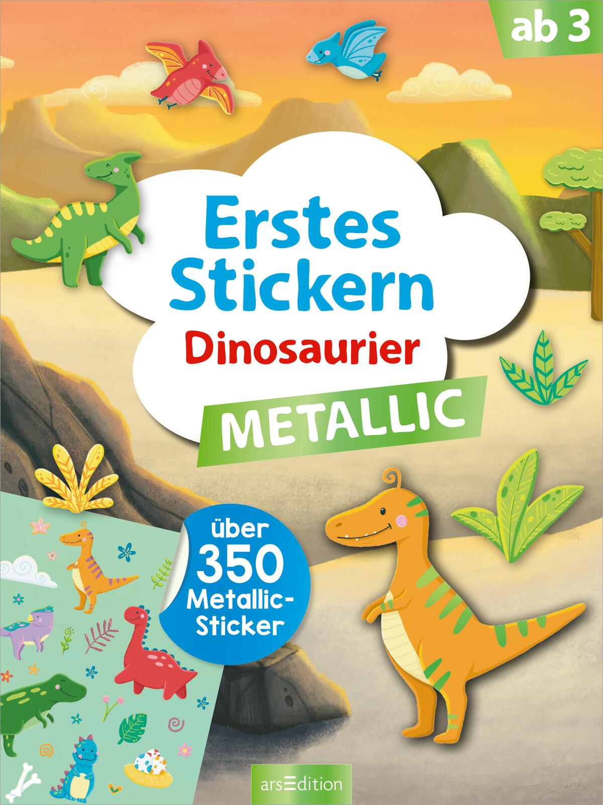 Tauche ein in die aufregende, schillernde Welt der Dinos! Auf den bunt illustrierten Seiten gibt es jede Menge Szenen zu entdecken: Von Vulkanlandschaften über saftiges Grasland bis hin zu Steinwüsten. Wähle aus über 350 Aufklebern mit coolem Metallic-Effekt und erschaffe einzigartige schillernde Szenen.