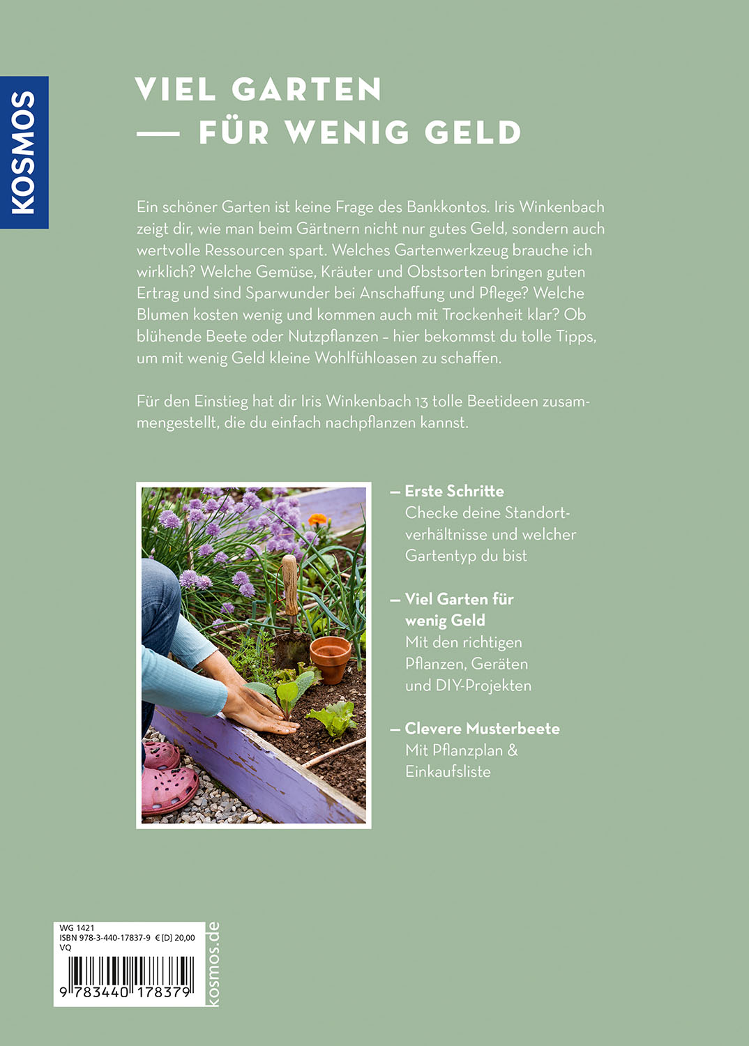 Ein schöner Garten ist keine Frage des Bankkontos. Dieser moderne Ratgeber zeigt, wie man beim Gärtnern nicht nur viel Geld, sondern auch wertvolle Ressourcen spart. Welches Gartenwerkzeug brauche ich wirklich? Welche Gemüse, Kräuter und Obstsorten bringen guten Ertrag und sind Sparwunder bei Anschaffung und Pflege? Welche Blumen kosten wenig und kommen auch mit Trockenheit klar? Ob blühende Beete oder Nutzpflanzen - Iris Winkenbach erklärt, wie man günstig gärtnert, Wasser spart, um mit wenig Geld kleine Wohlfühloasen zu schaffen.