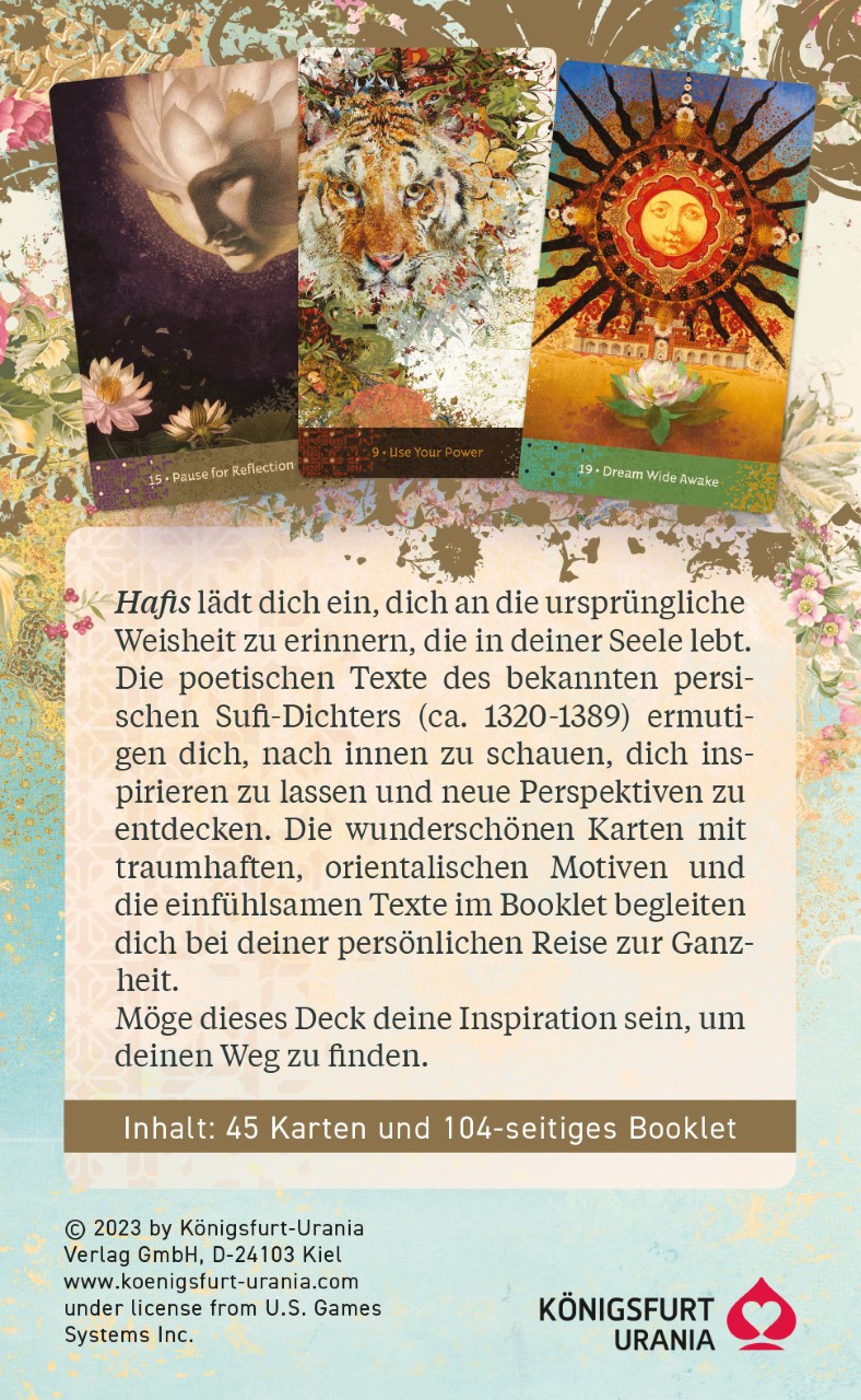 lt;br>Hafis, der beliebteste Dichter der Perser, lädt dich mit seinen Versen ein, dich an die ursprüngliche Weisheit zu erinnern, die in deiner Seele lebt. Die poetischen Texte des bekannten spirituellen Lehrers und Sufi-Dichters (ca. 1320-1389) ermutigen dich, nach innen zu schauen, dich inspirieren zu lassen und neue Perspektiven zu entdecken. Jede Karte fordert dich zu etwas auf - die Texte im Booklet erklären die Hintergründe, das Ziel und den Weg. Die wunderschönen Karten mit traumhaften, orientalischen Motiven und die einfühlsamen Texte sollen ein Licht in deinem Herzen anzünden und dich begleiten auf deinem Weg zu einem angstfreien, erfüllten und entspannten Leben. Ein kluger Weiser sagte einmal über die Menschen: "Wir bringen uns alle nur gegenseitig nach Hause." Möge dieses Deck deine Inspiration sein, um deinen Weg zu finden.