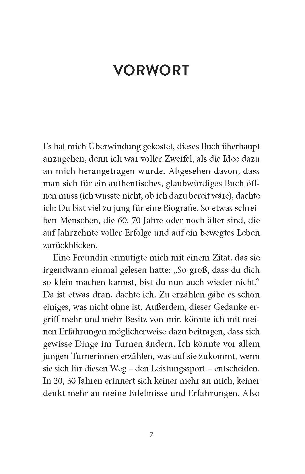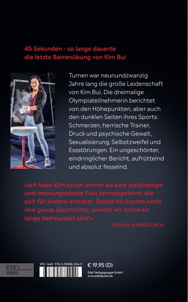Die deutsche Ausnahmeturnerin Kim Bui schildert ihren Weg zum Leistungssport ab dem zehnten Lebensjahr. Turnen ist für sie die schönste Sportart der Welt, ihre Karriere aber auch mit vielen Entbehrungen, Tränen, Schmerzen und Verletzungen verbunden. Sie beschreibt eindringlich, welchen Willen und welcher Leidenschaft es bedarf, um Tag für Tag stundenlang für einen Wettkampf zu trainieren, der nur 45 Sekunden dauert. Was es bedeutet, als olympische Spitzenathletin in bescheidenen wirtschaftlichen Bedingungen zu leben und sich parallel um eine Berufsausbildung zu kümmern. Dabei setzt die jahrelange Athletensprecherin sich auch kritisch mit den Schattenseiten des Turnsports und hochsensiblen Themen wie Sexualisierung, Essstörungen, seelischem Missbrauch und Zukunftsängsten auseinander. Dabei legt sie Wunden offen, ohne verletzend zu sein. Ihr Buch ist ein zutiefst menschlicher Appell an die Gesellschaft, sportliche Leistung auch jenseits der olympischen Medaillenränge wertzuschätzen.