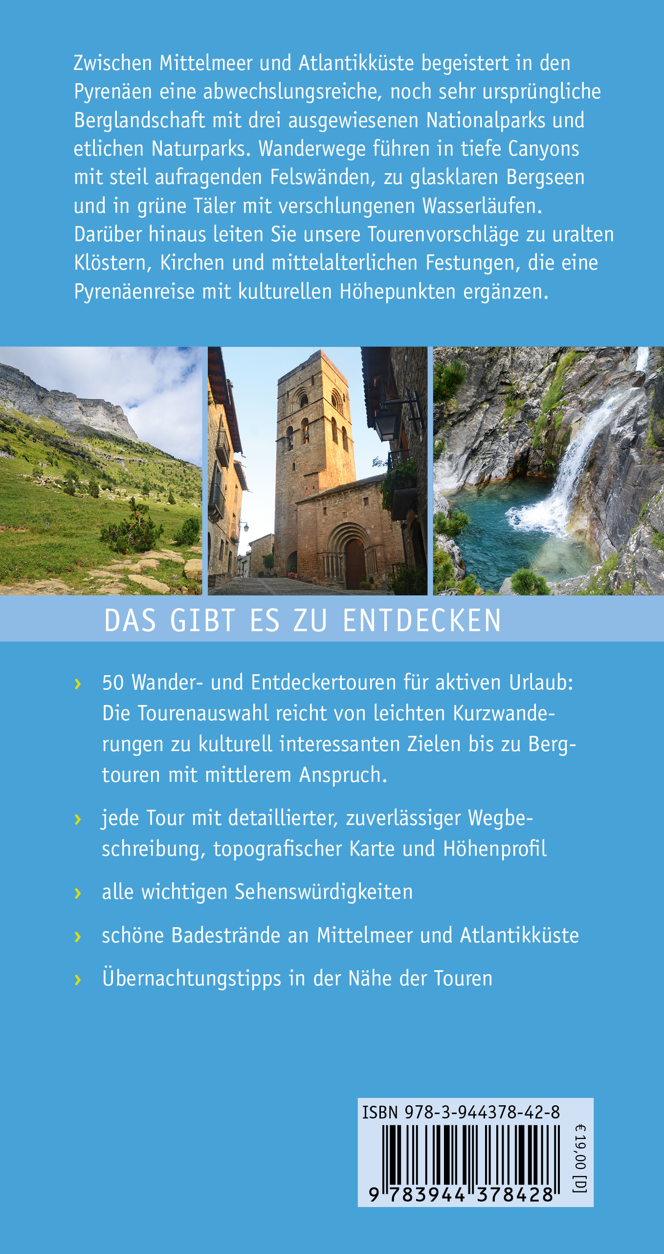 Zwischen Mittelmeer und Atlantikküste begeistert in den Pyrenäen eine abwechslungsreiche, noch sehr ursprüngliche Berglandschaft mit drei ausgewiesenen Nationalparks und etlichen Naturparks. Wanderwege führen in tiefe Canyons mit steil aufragenden Felswänden, zu glasklaren Bergseen und in grüne Täler mit verschlungenen Wasserläufen. Darüber hinaus leiten Sie unsere Tourenvorschläge zu uralten Klöstern, Kirchen und mittelalterlichen Festungen, die eine Pyrenäenreise mit kulturellen Höhepunkten ergänzen.Das gibt es zu entdecken:- 50 Wander- und Entdeckertouren für aktiven Urlaub: Die Tourenauswahl reicht von leichten Kurzwanderungen zu kulturell interessanten Zielen bis zu Bergtouren mit mittlerem Anspruch.- jede Tour mit detaillierter, zuverlässiger Wegbeschreibung, topografischer Karte und Höhenprofil- alle wichtigen Sehenswürdigkeiten- Übernachtungstipps in der Nähe der Touren